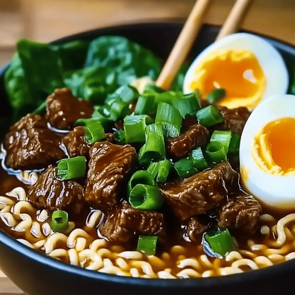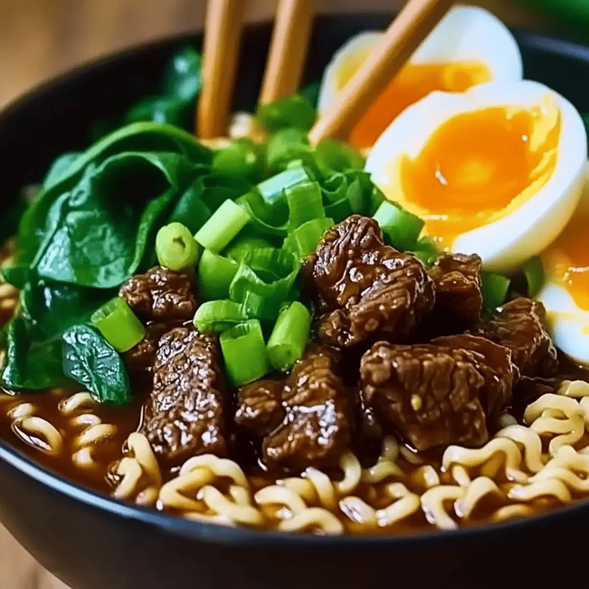 In serving bowls, place a generous amount of the cooked ramen noodles. Ladle the tender beef, savory broth, and wilted spinach over the noodles. Garnish with chopped green onions and, if desired, a soft-boiled egg sliced in half. A drizzle of Sriracha or chili oil adds a wonderful kick to your Beef Ramen Noodles!