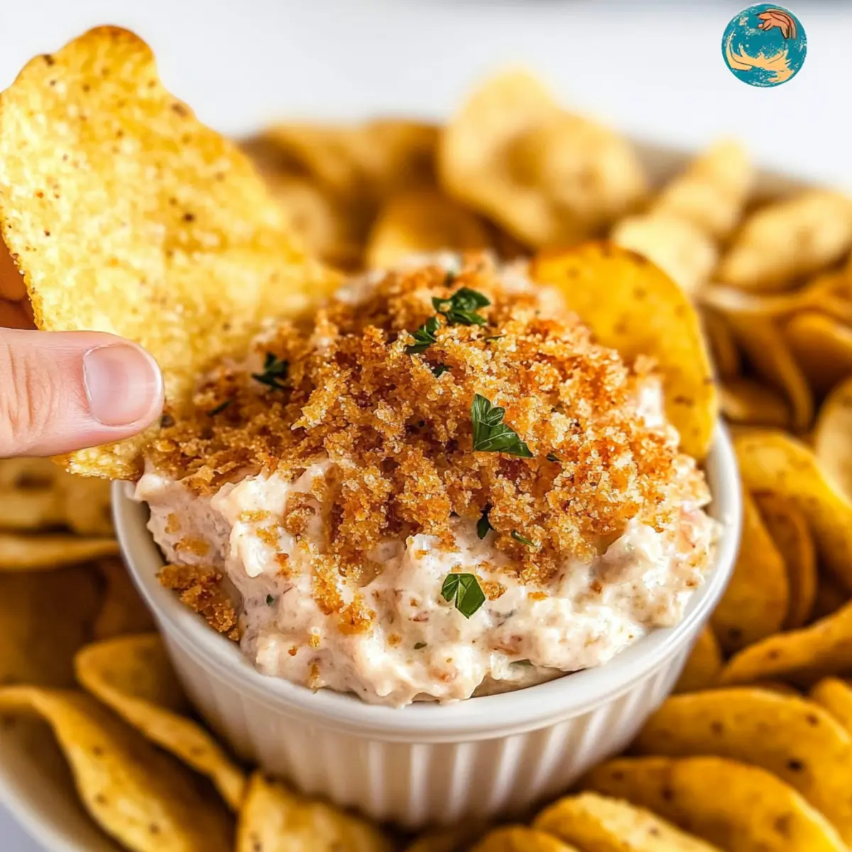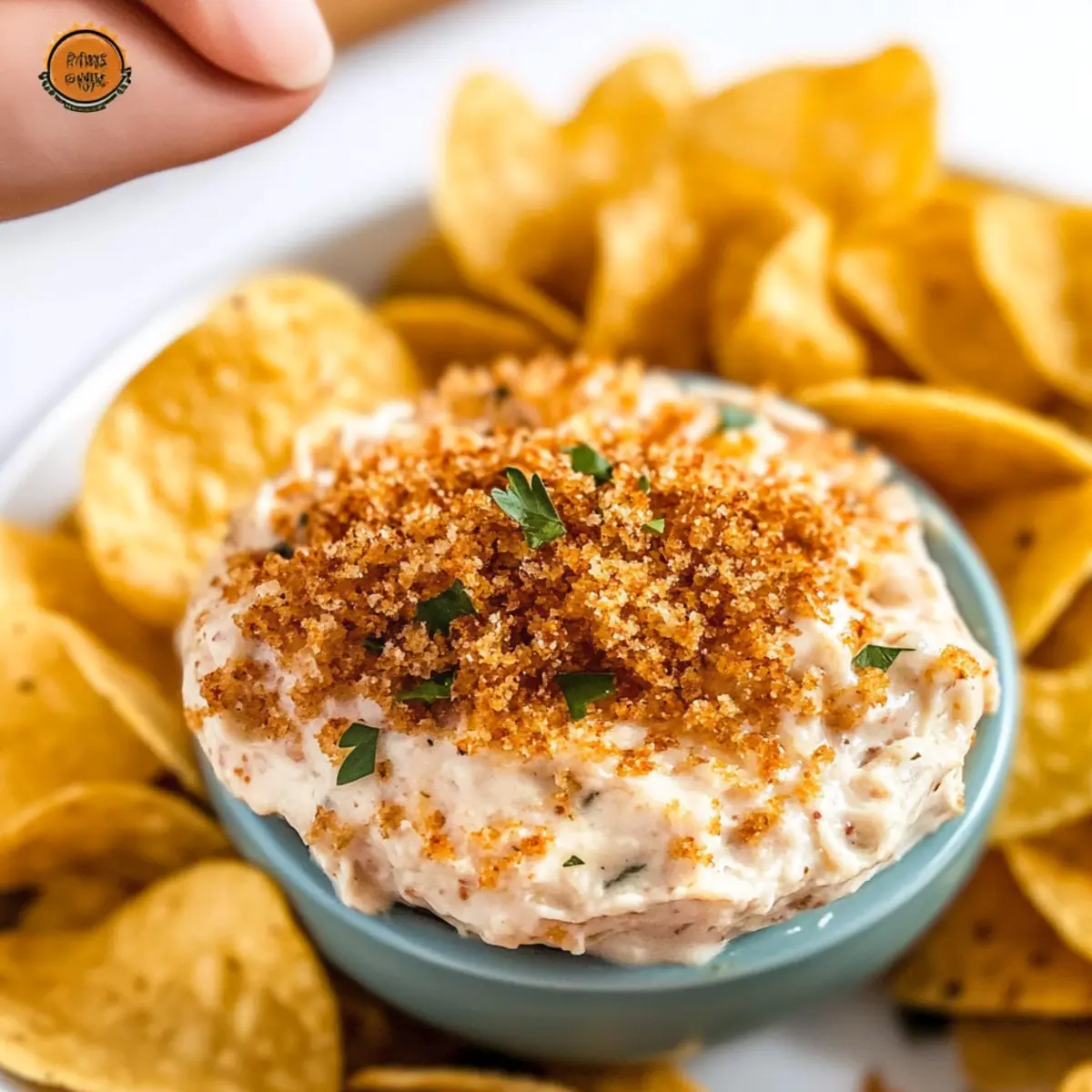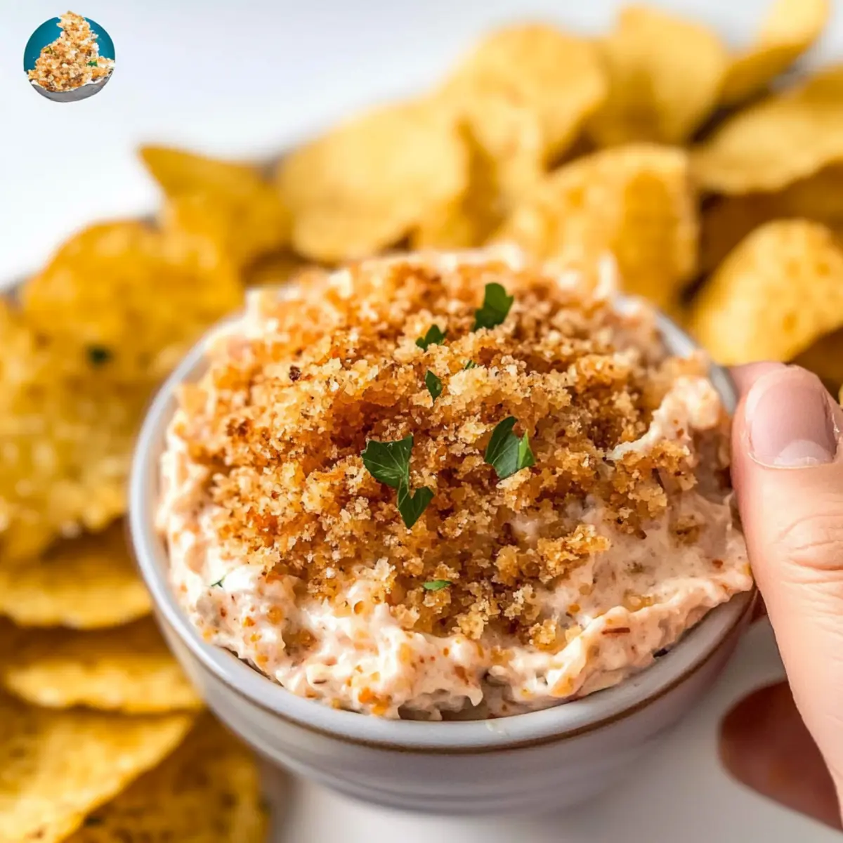 - Transfer the dip into a serving bowl, top with reserved breadcrumbs, and garnish with parsley.