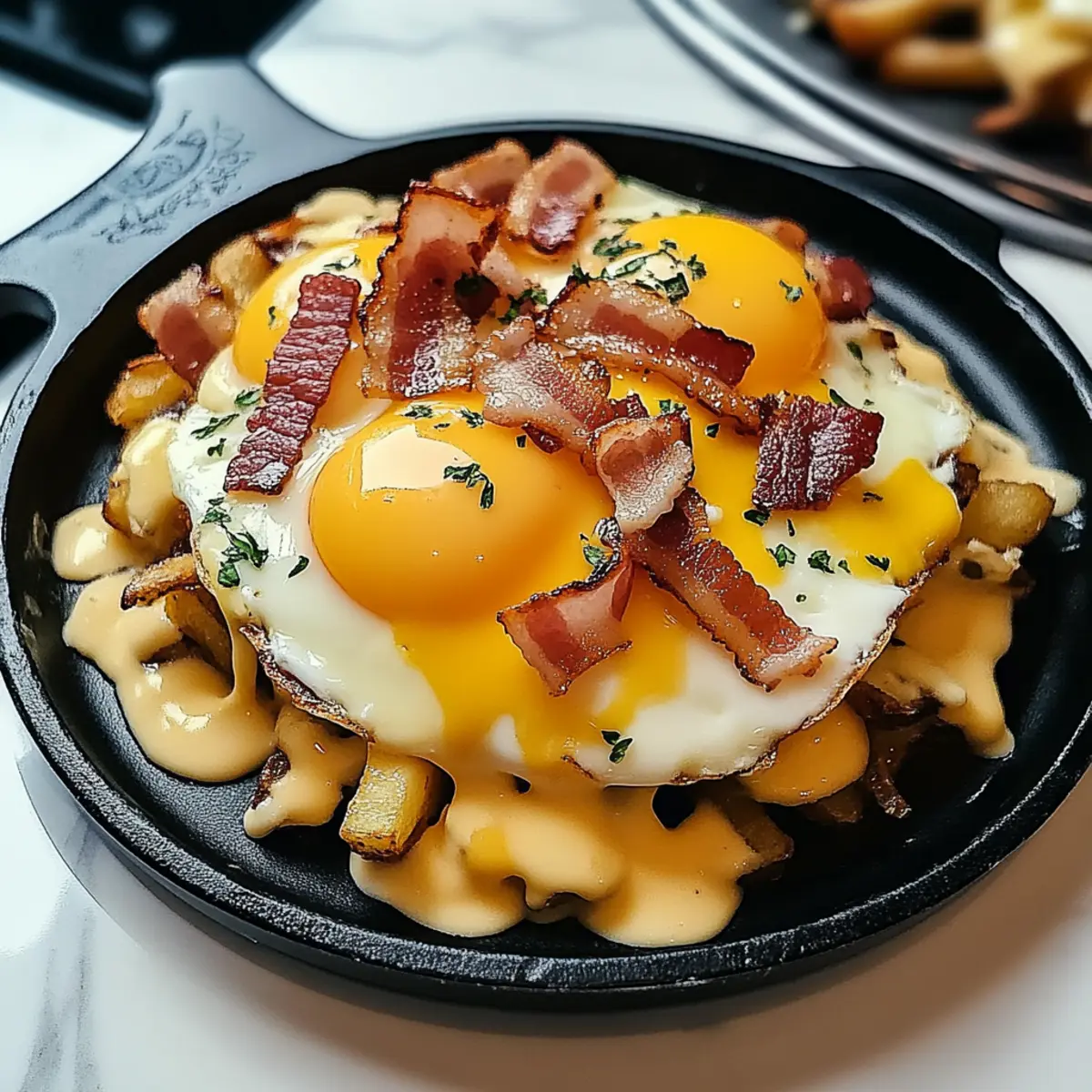Using the same skillet with the leftover bacon fat, add a bit of unsalted butter over medium heat. Crack in the large eggs and cook to your preference—3–4 minutes for sunny-side up. Ensure the egg whites are set while the yolks remain runny. Season lightly with salt and pepper, then keep the eggs warm until it’s time to assemble your hearty breakfast poutine.