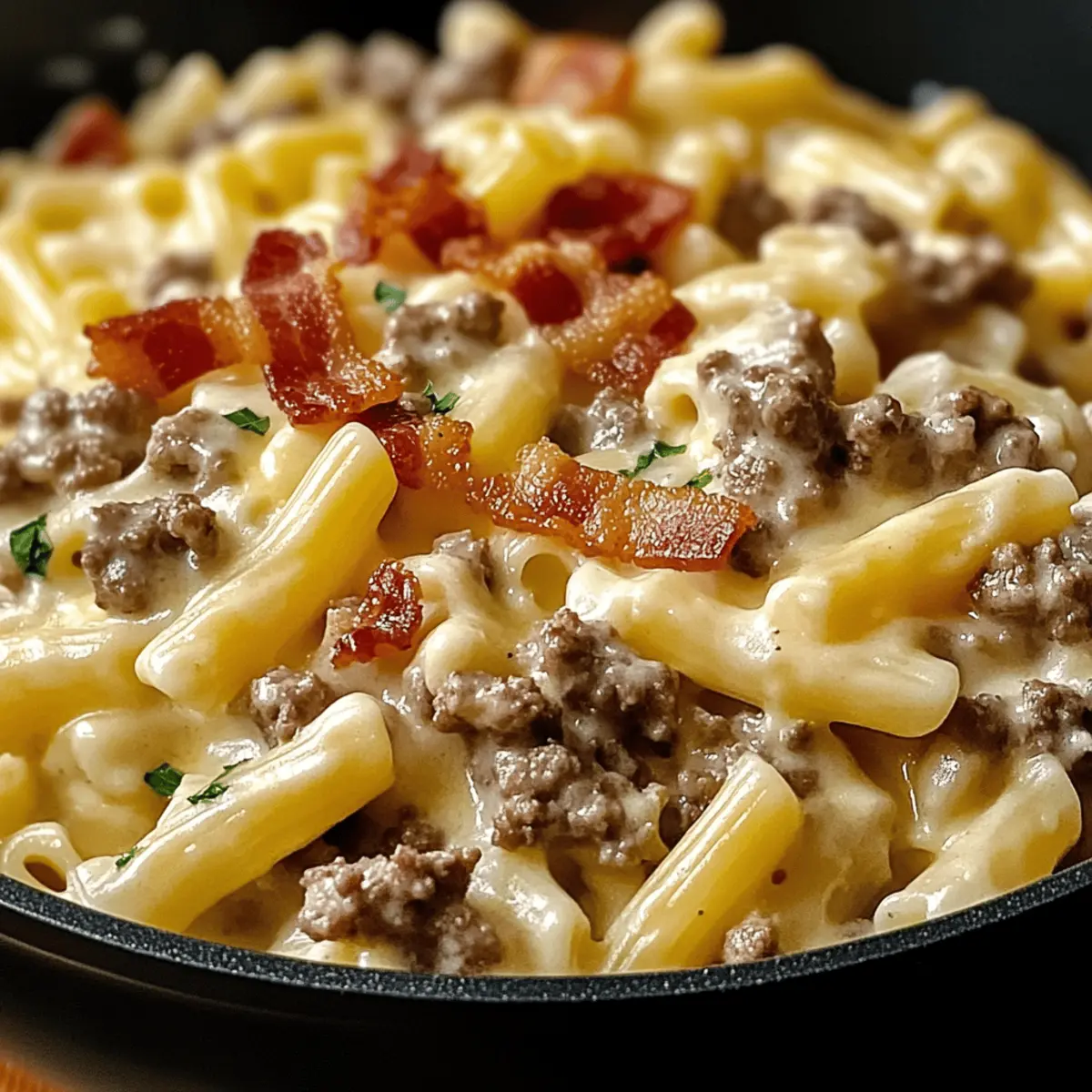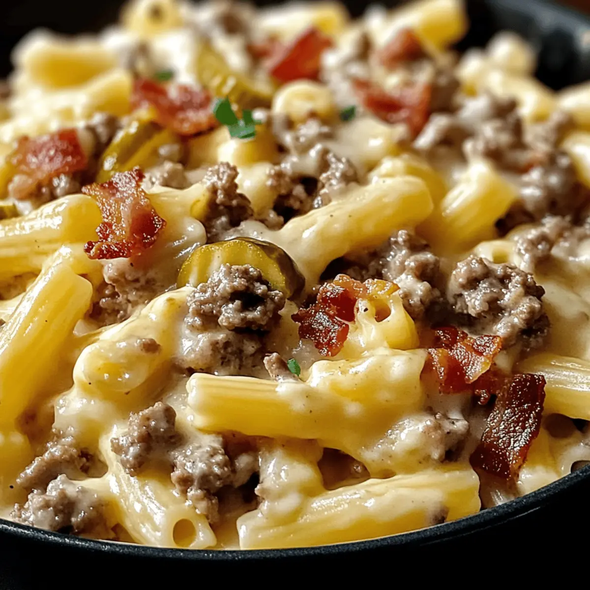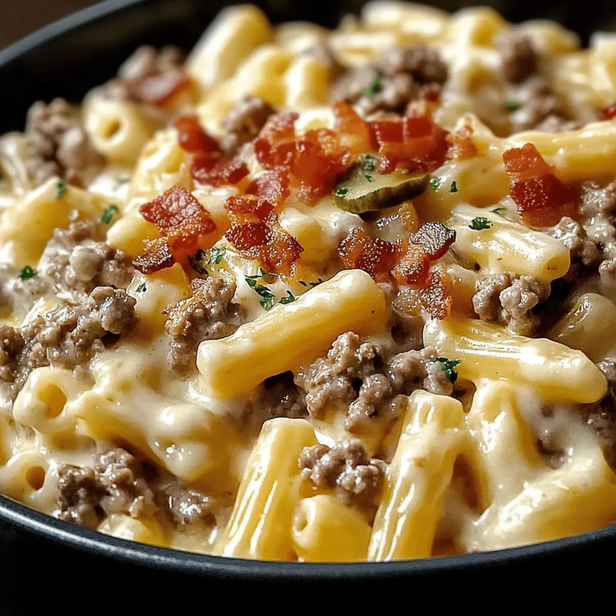 Comforting, Hearty Meal: This dish perfectly blends the classic cheeseburger with creamy pasta for a feel-good feast.