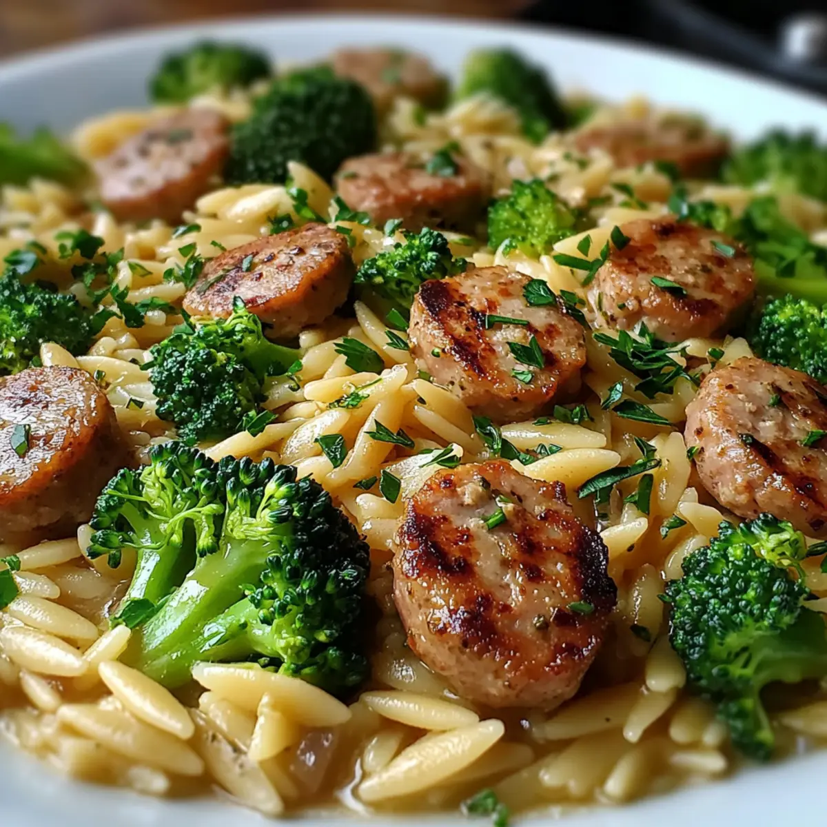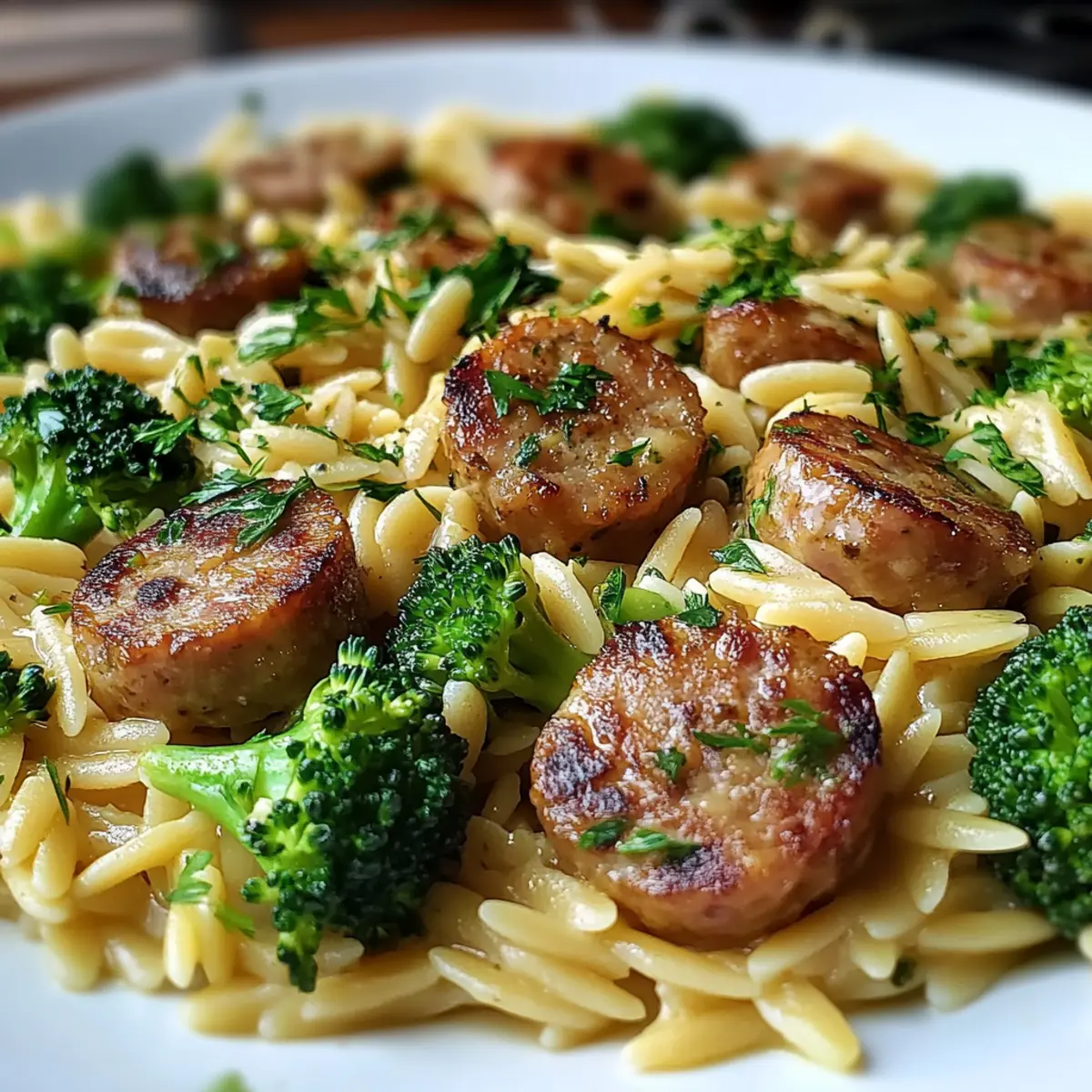 Serve the Chicken Sausage Broccoli Orzo Meal warm, garnishing with fresh parsley for a touch of brightness. This final step not only enhances presentation but also adds a fresh note to the dish, making it a satisfying meal for any occasion.