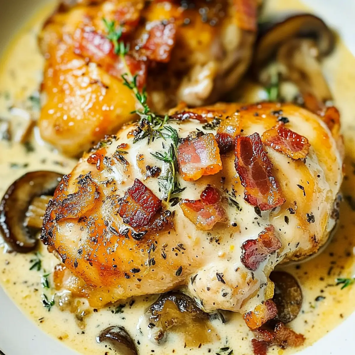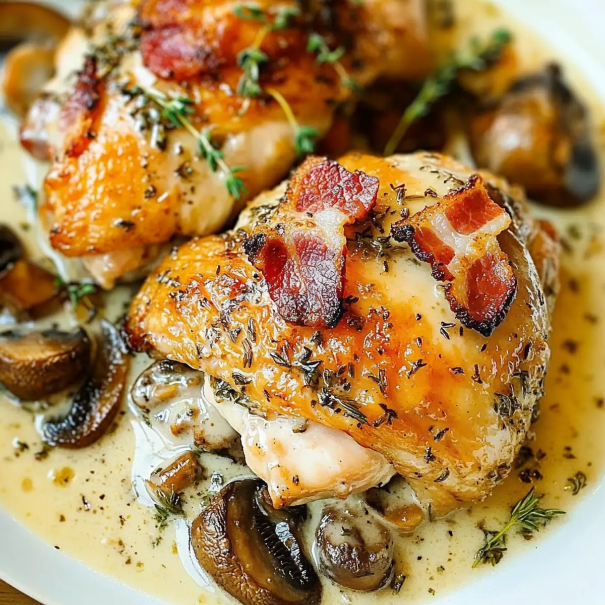 Decadent Flavor: A rich, creamy sauce featuring bacon and mushrooms wraps each tender chicken thigh, promising satisfying bites.