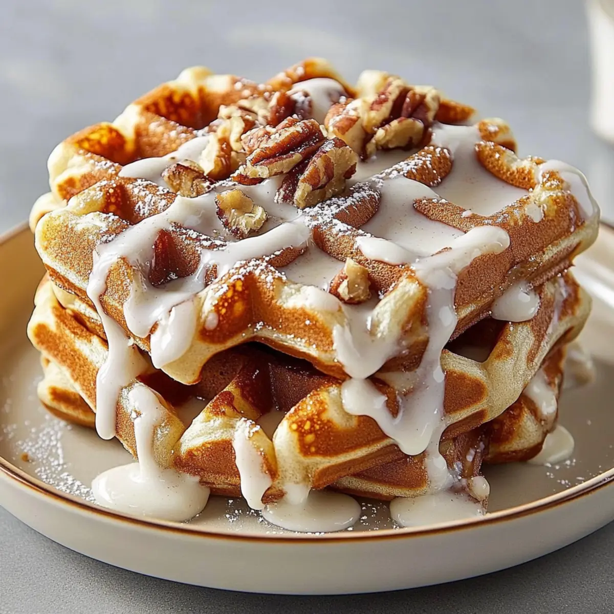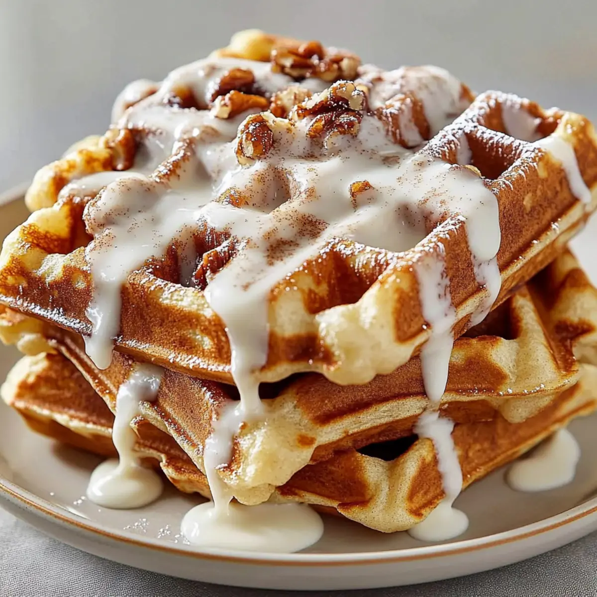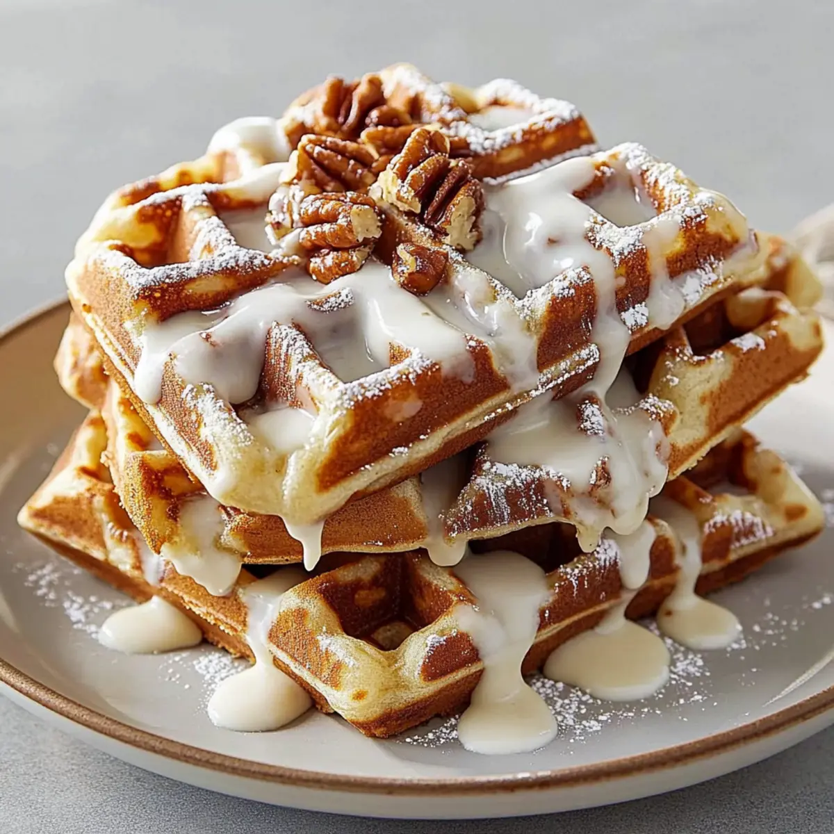 Once cooked, stack your warm Cinnamon Roll Waffles on a plate. Generously drizzle the cream cheese mixture over the top, allowing it to cascade down the sides. For an added touch, consider topping with toasted pecans or walnuts for that extra crunch. These waffles promise to make your morning truly special!