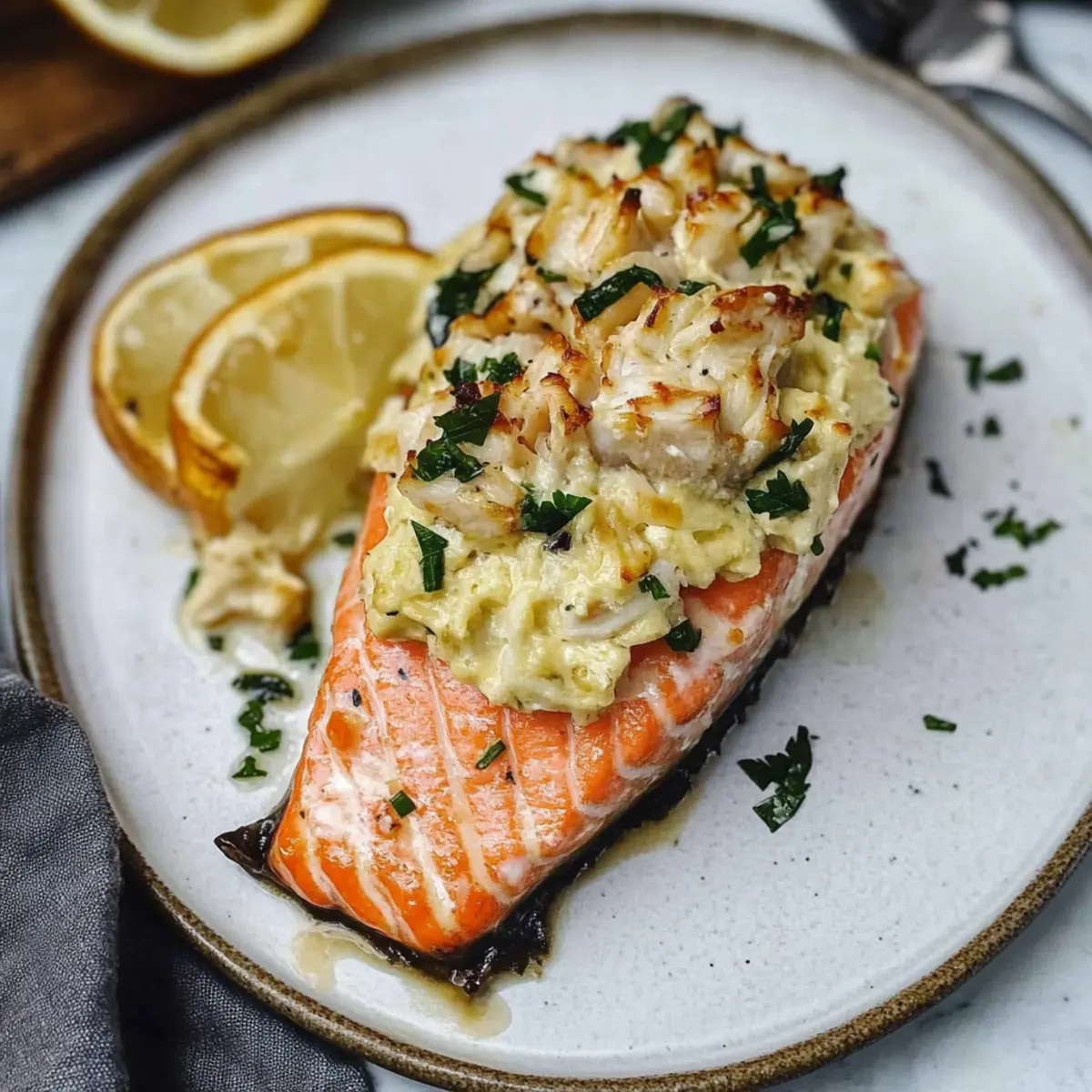 Remove the crab stuffed salmon from the oven and let it rest for a few minutes. Sprinkle with additional chopped parsley or thinly sliced chives for a fresh touch. Serve immediately with lemon wedges on the side, allowing diners to squeeze fresh lemon juice over the salmon for an extra burst of flavor that perfectly complements the rich crab filling.