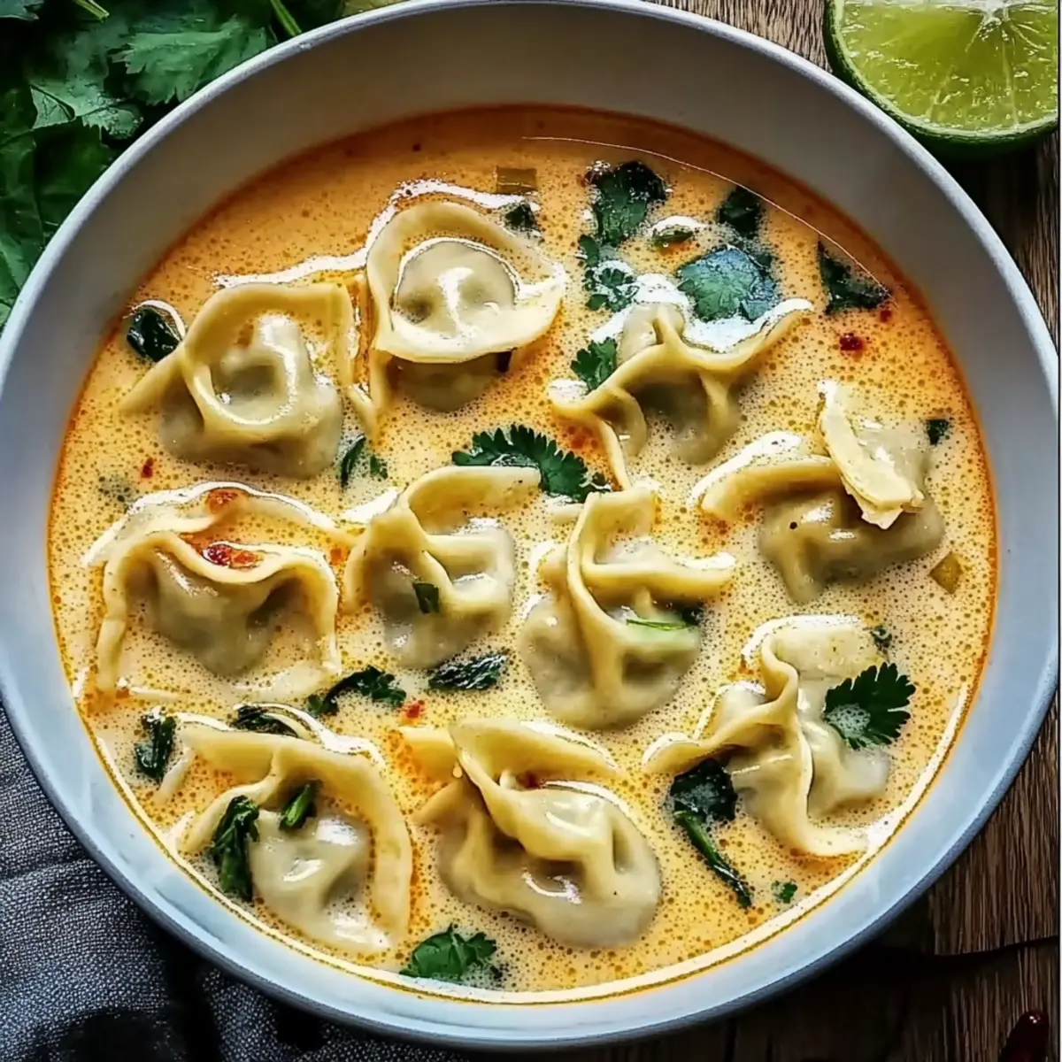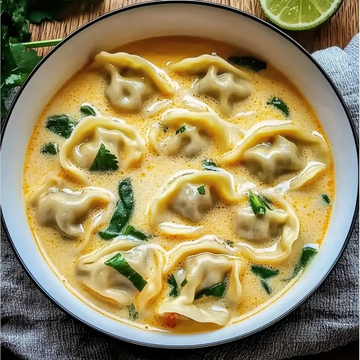 Taste your Creamy Thai Dumpling Soup and adjust the seasoning if needed. Ladle the soup into bowls, garnishing each serving with fresh cilantro and lime wedges for a burst of brightness. Serve warm, and savor the comforting combination of flavors and textures in every generous bowlful.
