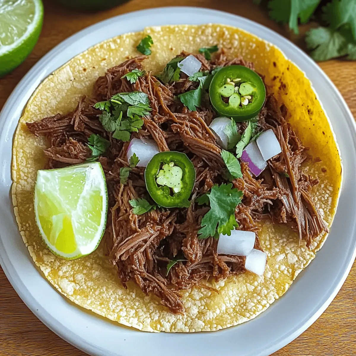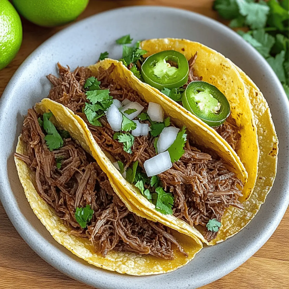 As I stirred the spices into the sizzling beef, a wave of mouth-watering aromas filled my kitchen, instantly taking me back to cozy family dinners. The star of the show? Flavorful Crock-Pot Shredded Beef Tacos, where tender, slow-cooked meat mingles with a symphony of spices for an unforgettable taco night. Not only are these tacos incredibly easy to prepare, but they also lend themselves to endless customization, making them a family favorite for weeknight meals or weekend gatherings. Just imagine coming home after a long day to the comforting scent of savory beef waiting for you—it’s pure bliss! Ready to dive into the world of delightful flavors and warm tortillas? Let’s get cooking!