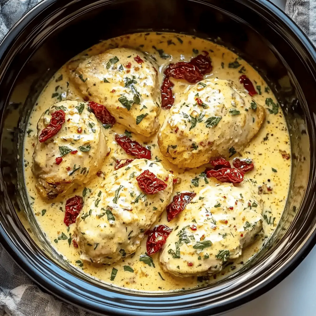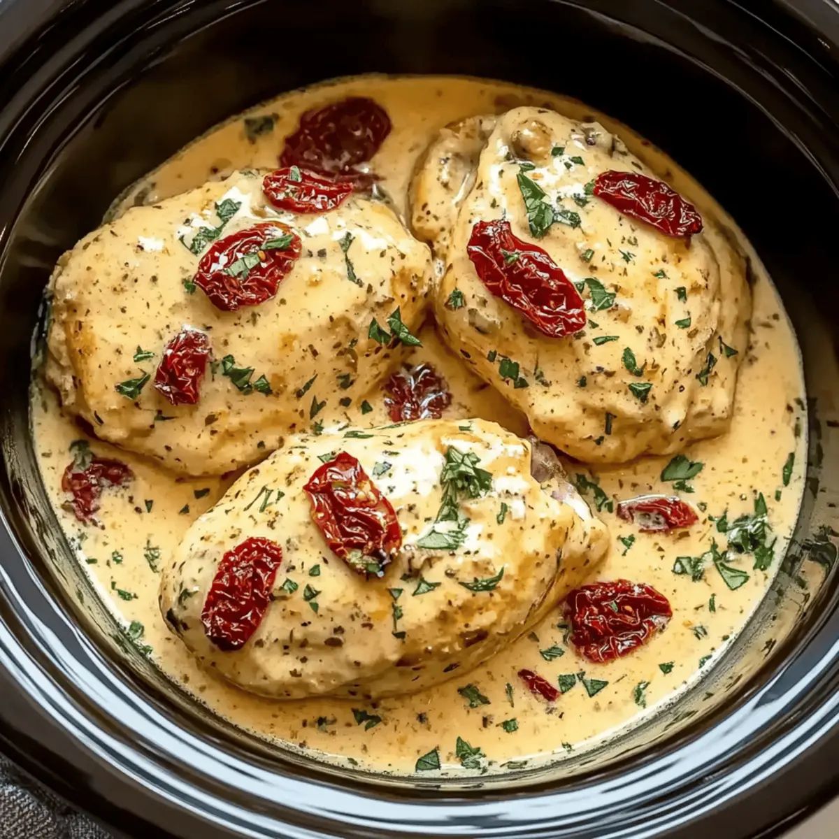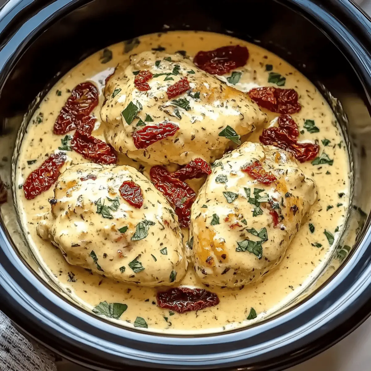 Next, sprinkle chopped sun-dried tomatoes evenly on top of the chicken and sauce. The sun-dried tomatoes will add a delightful sweetness and tanginess, enhancing the overall flavor of the dish. This step is crucial for bringing the comforting essence of your Dump & Go Crockpot Marry Me Chicken to life.