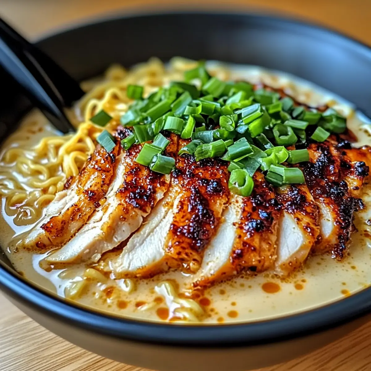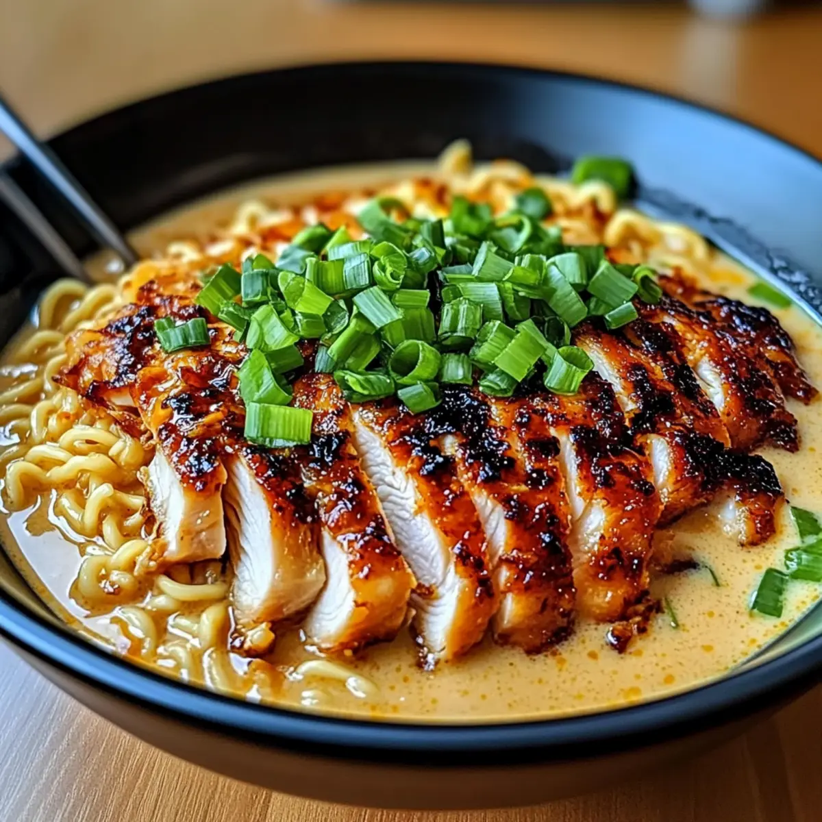 - Assemble by placing ramen in bowls, topping with creamy sauce and sliced chicken.