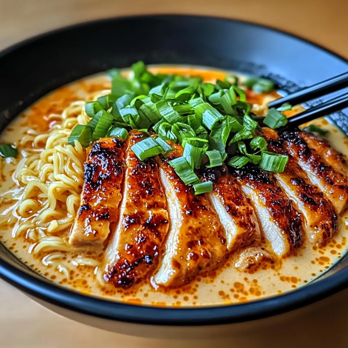 Finish off your Fiery Chicken Ramen with freshly chopped green onions sprinkled on top for a bright, fresh crunch. Serve the bowls warm, encouraging your guests to mix in the incredible creamy sauce with their noodles and chicken. This inviting aroma and vibrant presentation will have everyone eager to dig in!