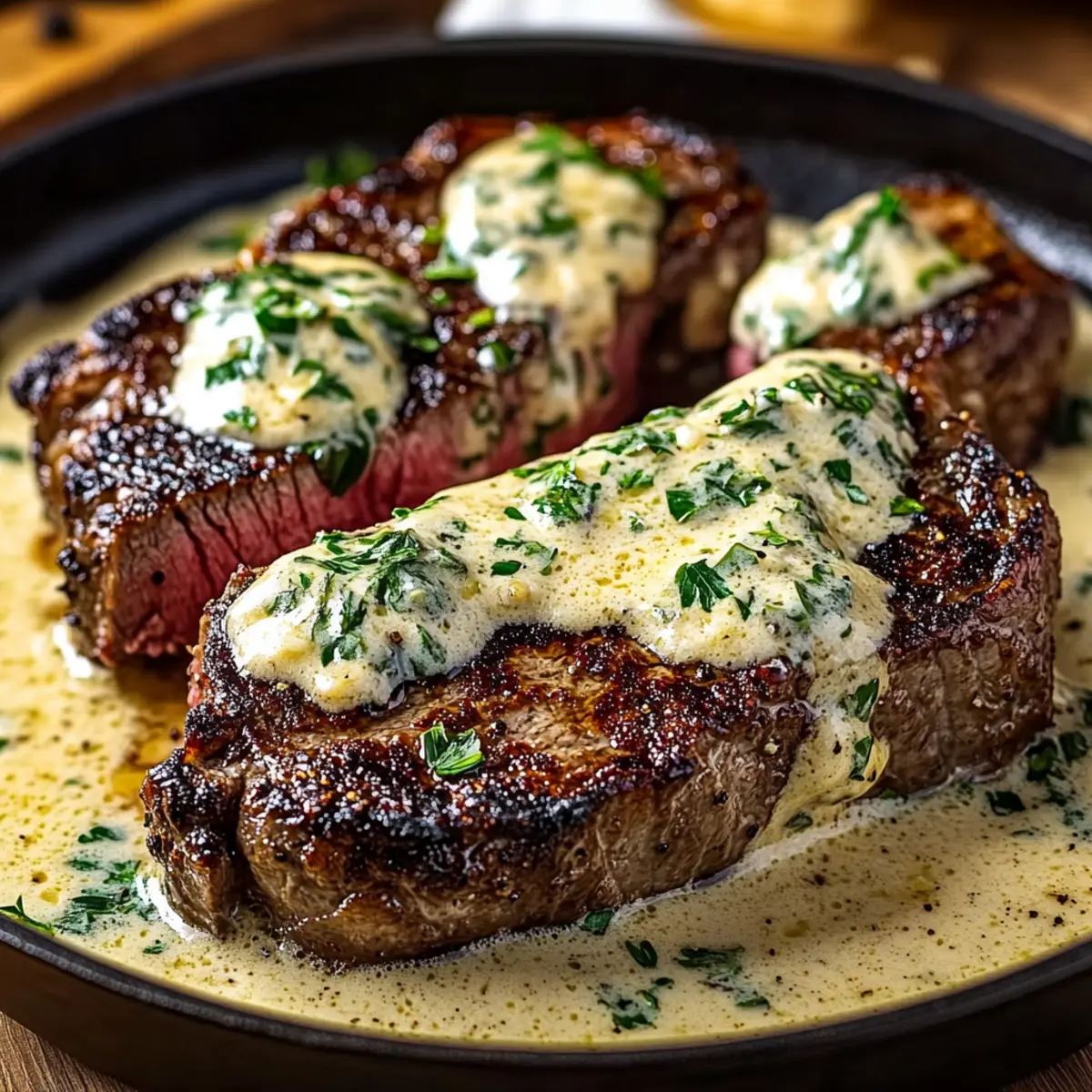 - Slice the rested steaks against the grain, arrange them on a plate, and drizzle with the Garlic Butter and Parmesan cream sauce. Garnish with chopped parsley.