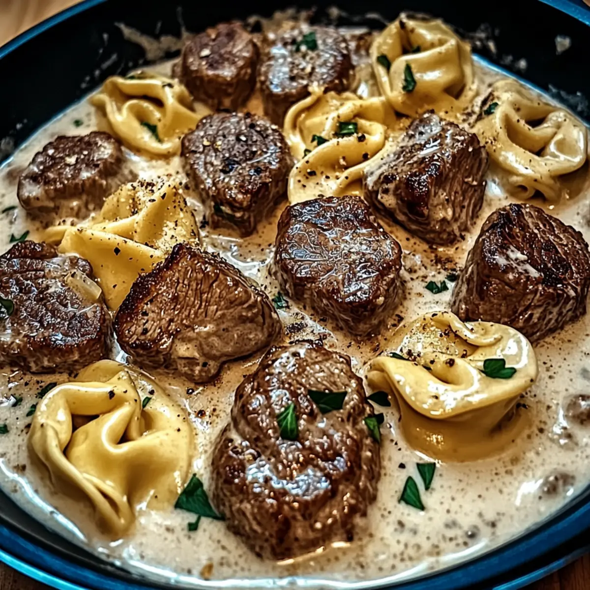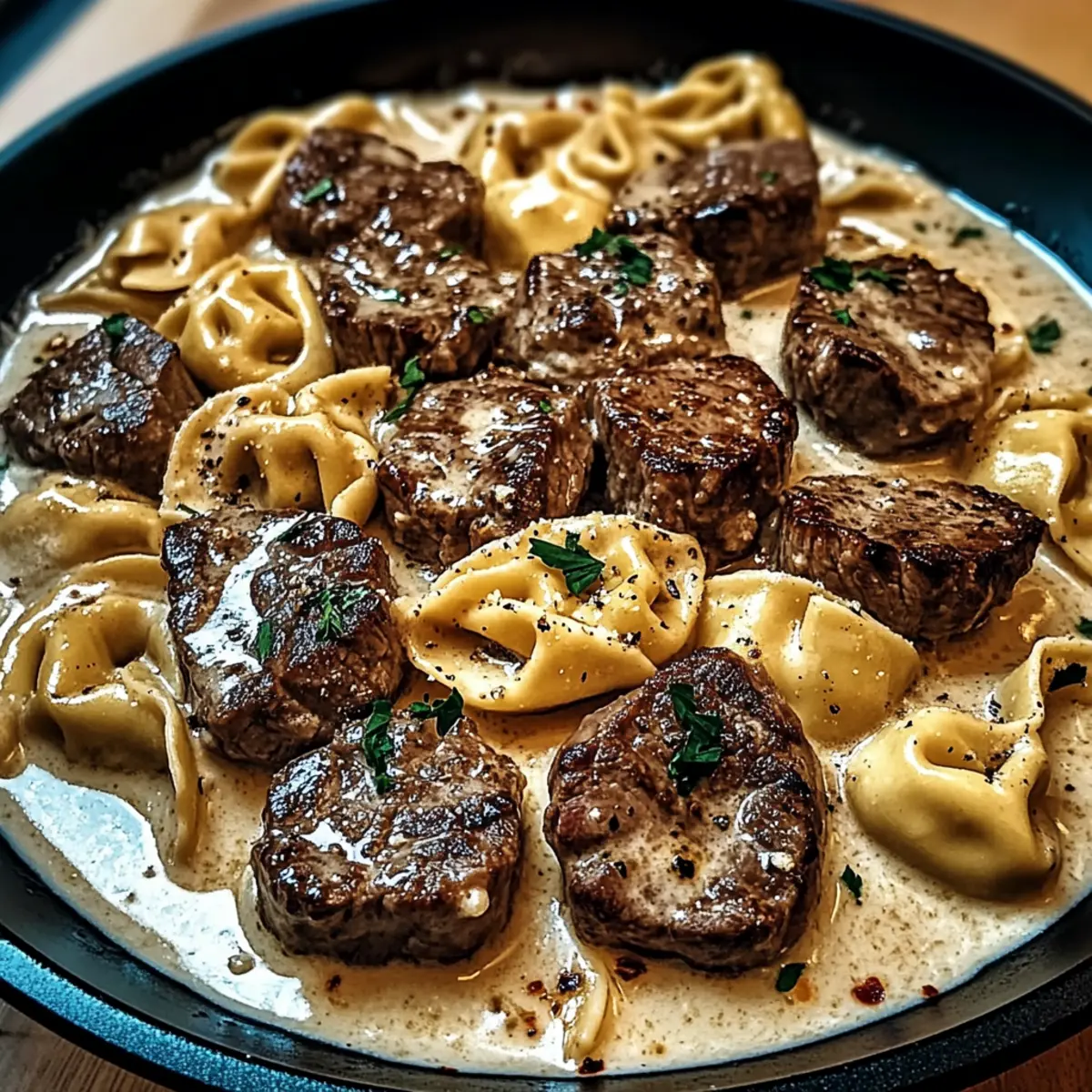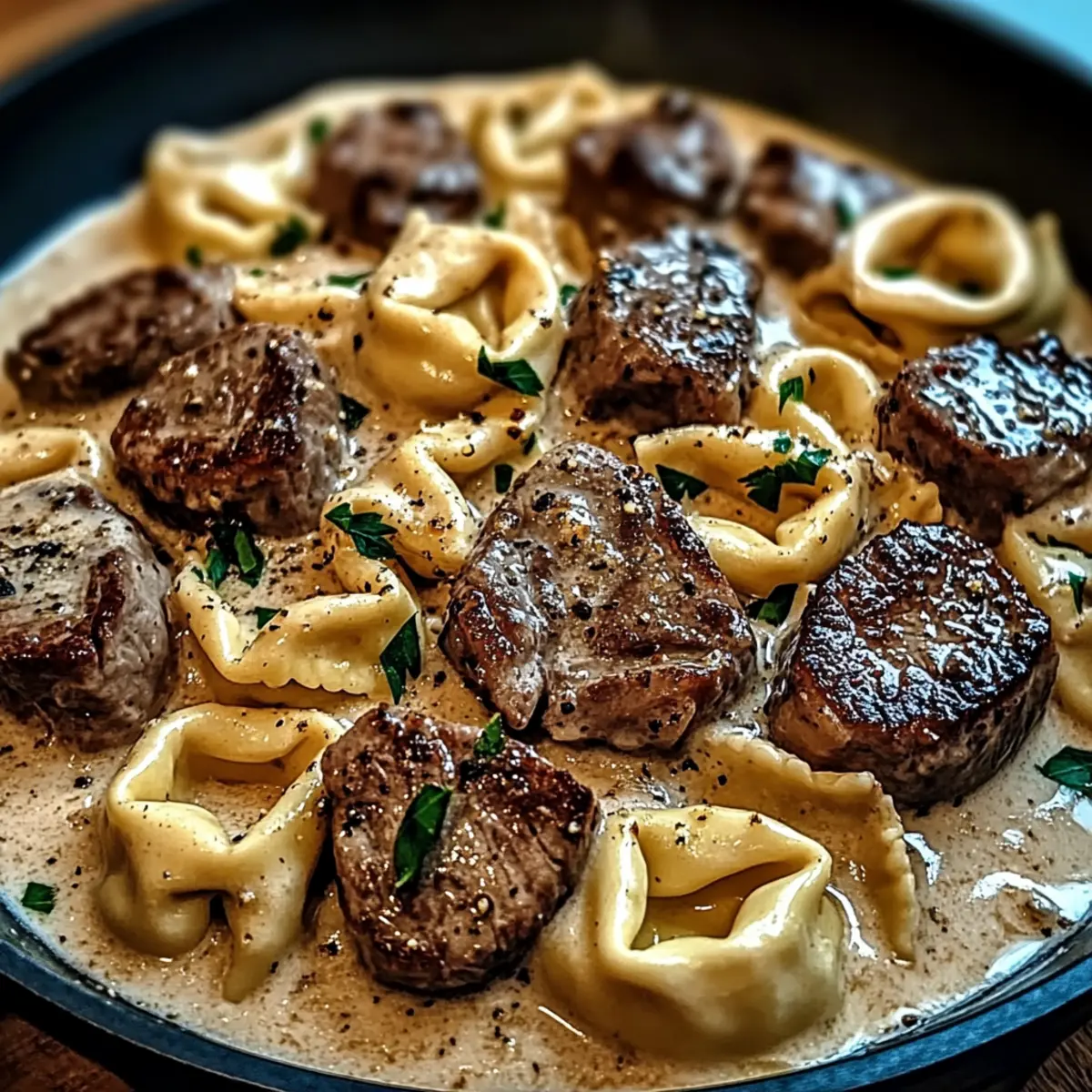 - Return the seared steak, sliced into bite-sized pieces, and the cooked tortellini to the skillet. Toss gently to coat in the sauce.