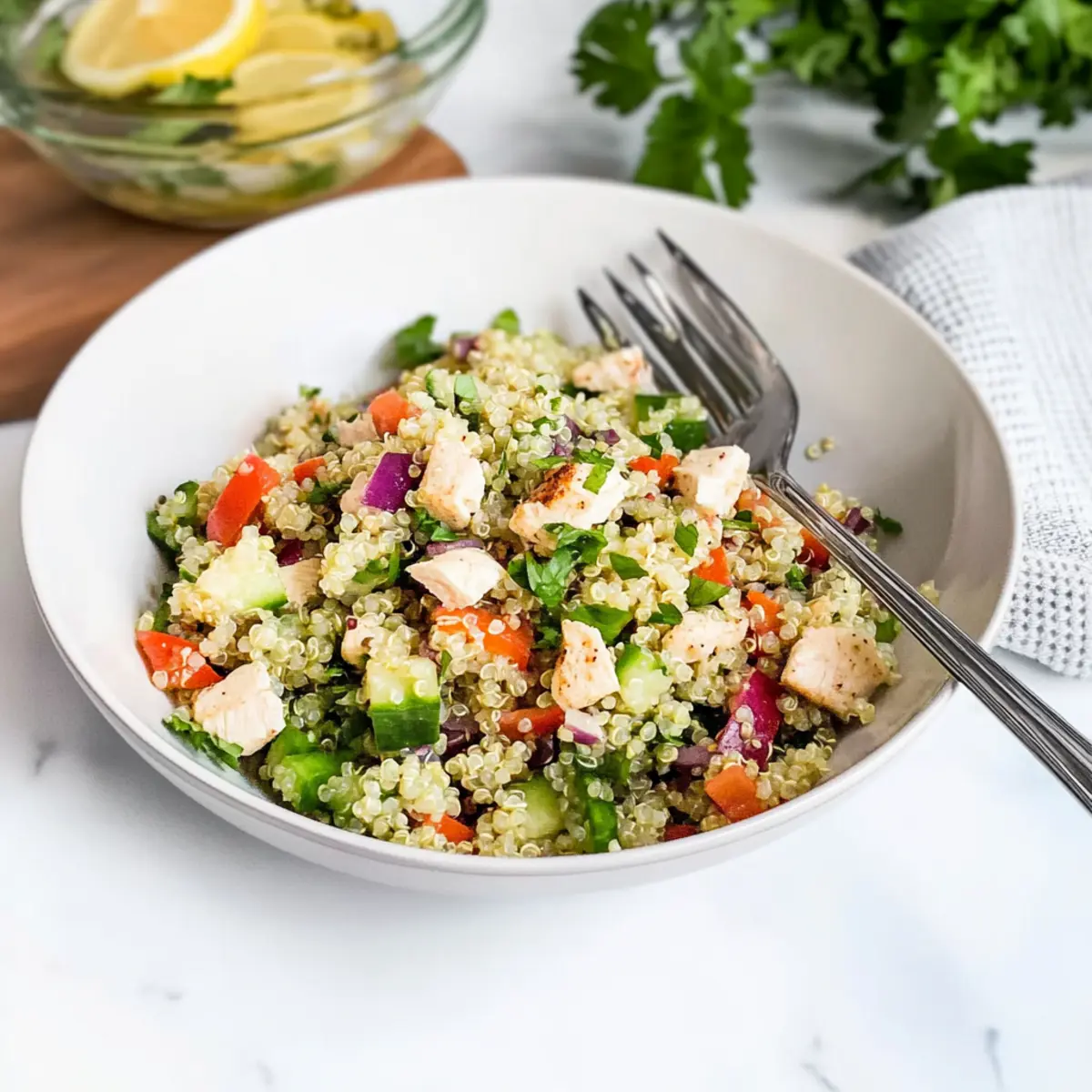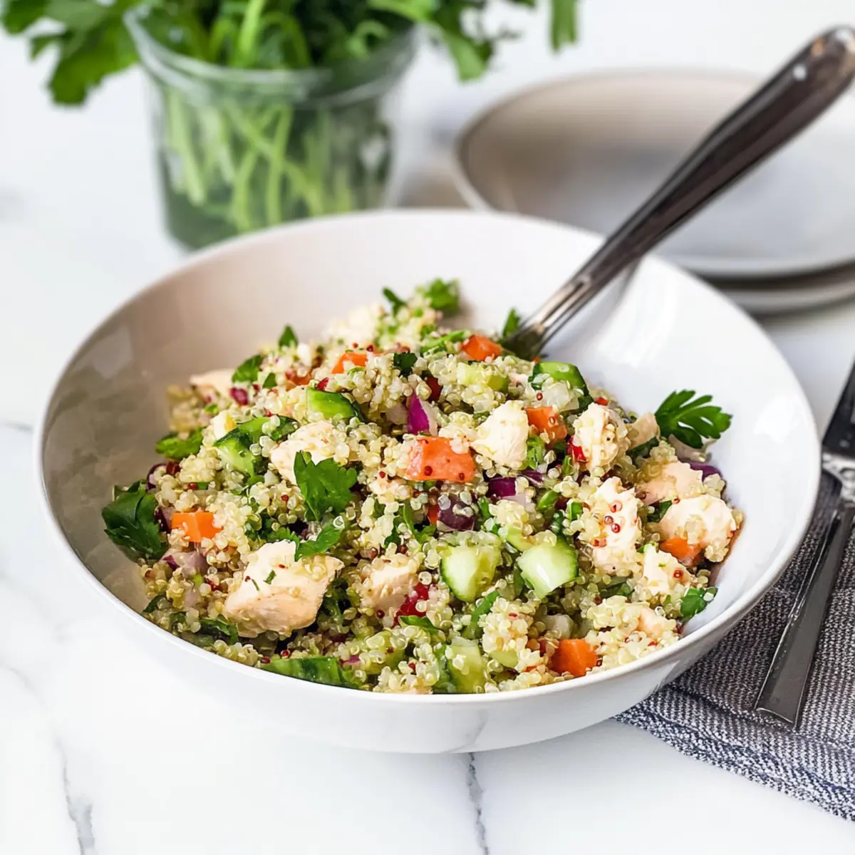 Preparing the Greek Quinoa Chicken Salad in advance can save you time on busy weekdays! You can cook the quinoa and chop all the fresh vegetables up to 24 hours ahead of serving. Store these components separately in airtight containers in the refrigerator to maintain their fresh textures. The dressing can also be whisked together 3 days in advance; just keep it in a sealed jar for the best flavor. When you’re ready to serve, simply combine all the ingredients in a large bowl, pour over the dressing, and toss gently to coat. This way, you’ll enjoy a delightful, restaurant-quality salad with minimal effort and all the wonderful flavors intact!