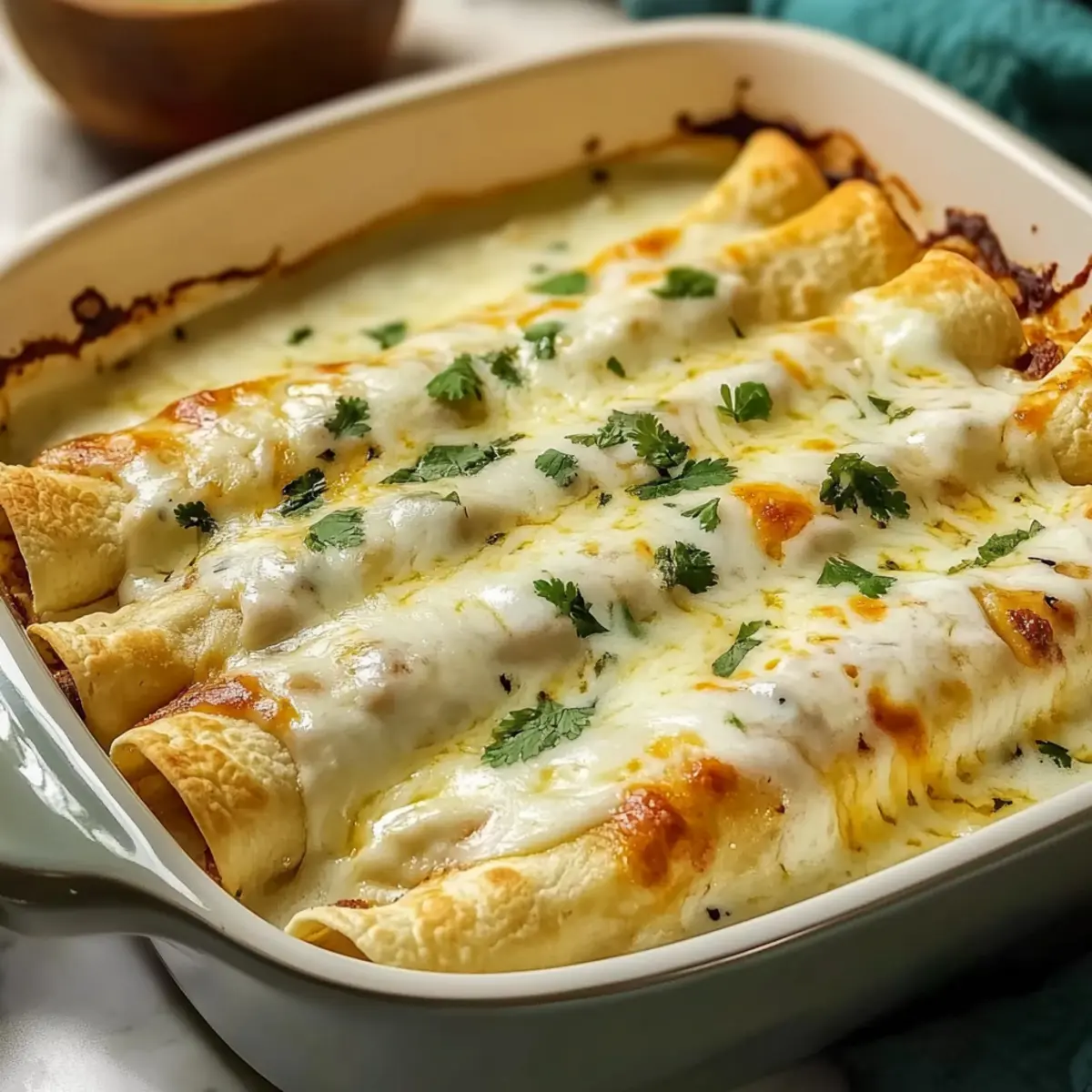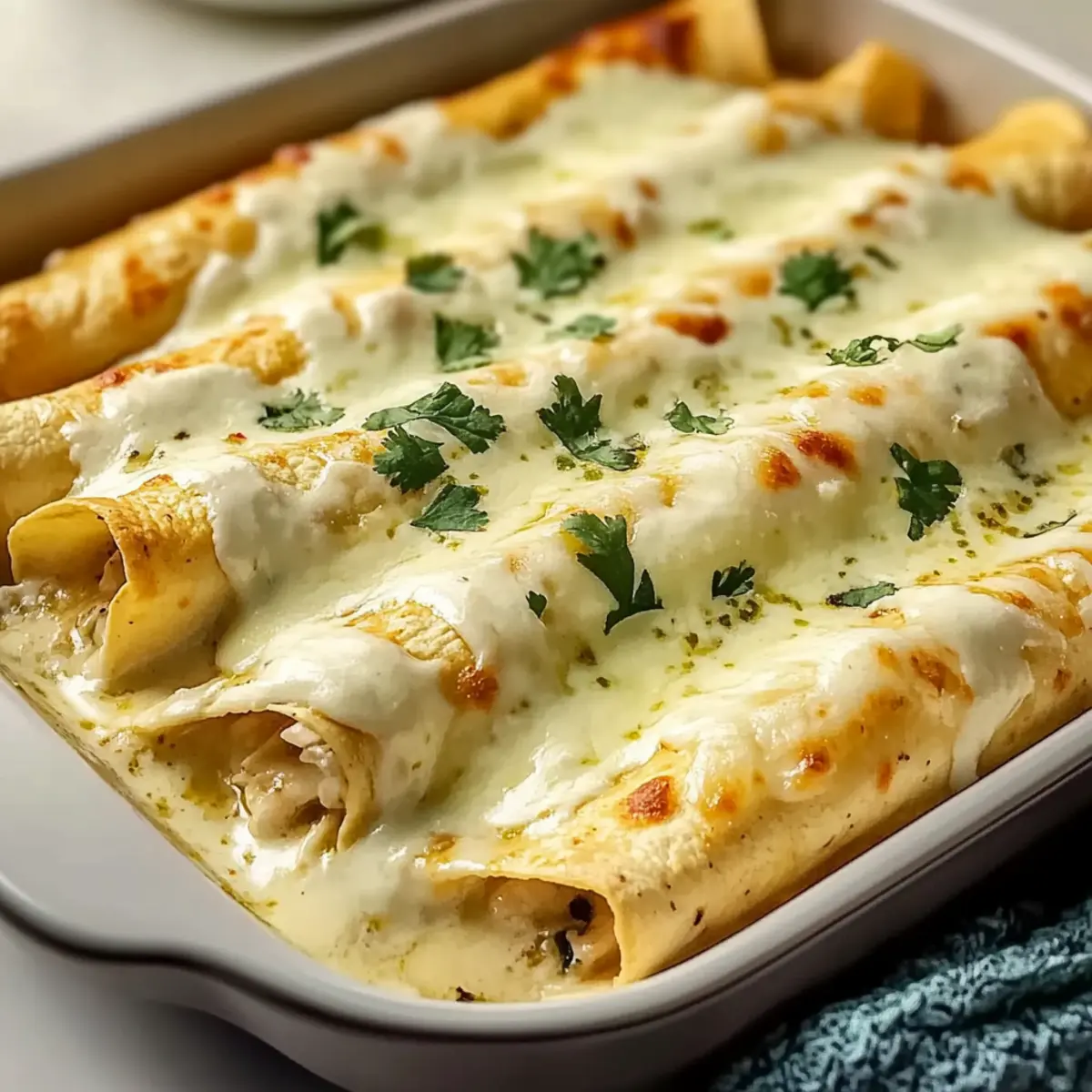Once baked, remove your enchiladas from the oven and let them rest for 2-3 minutes. This resting time allows the sauce to thicken slightly, making them easier to serve. Garnish with chopped parsley or cilantro before enjoying your delicious Green Chile Chicken Enchiladas with White Sauce!