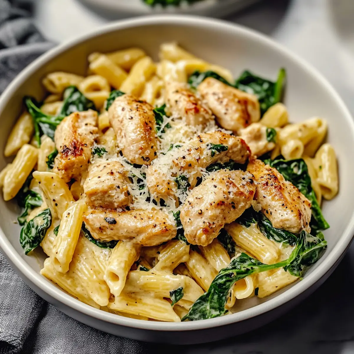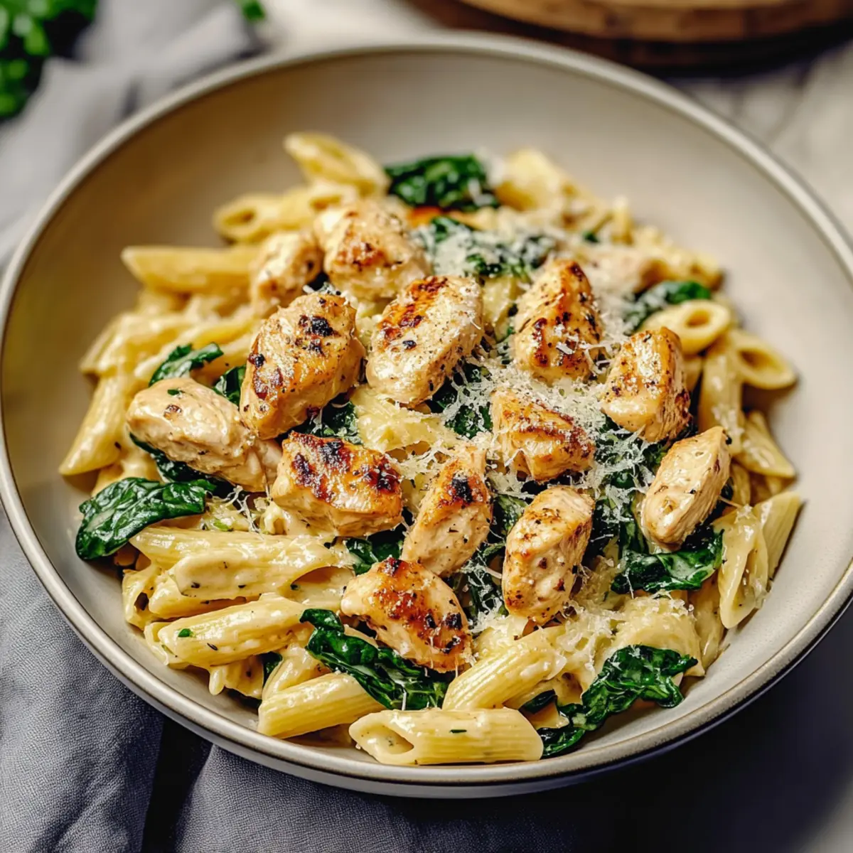 - Combine chicken, drained pasta, and spinach into the skillet. Toss until well coated and cook for another 1-2 minutes, then serve garnished with parsley.