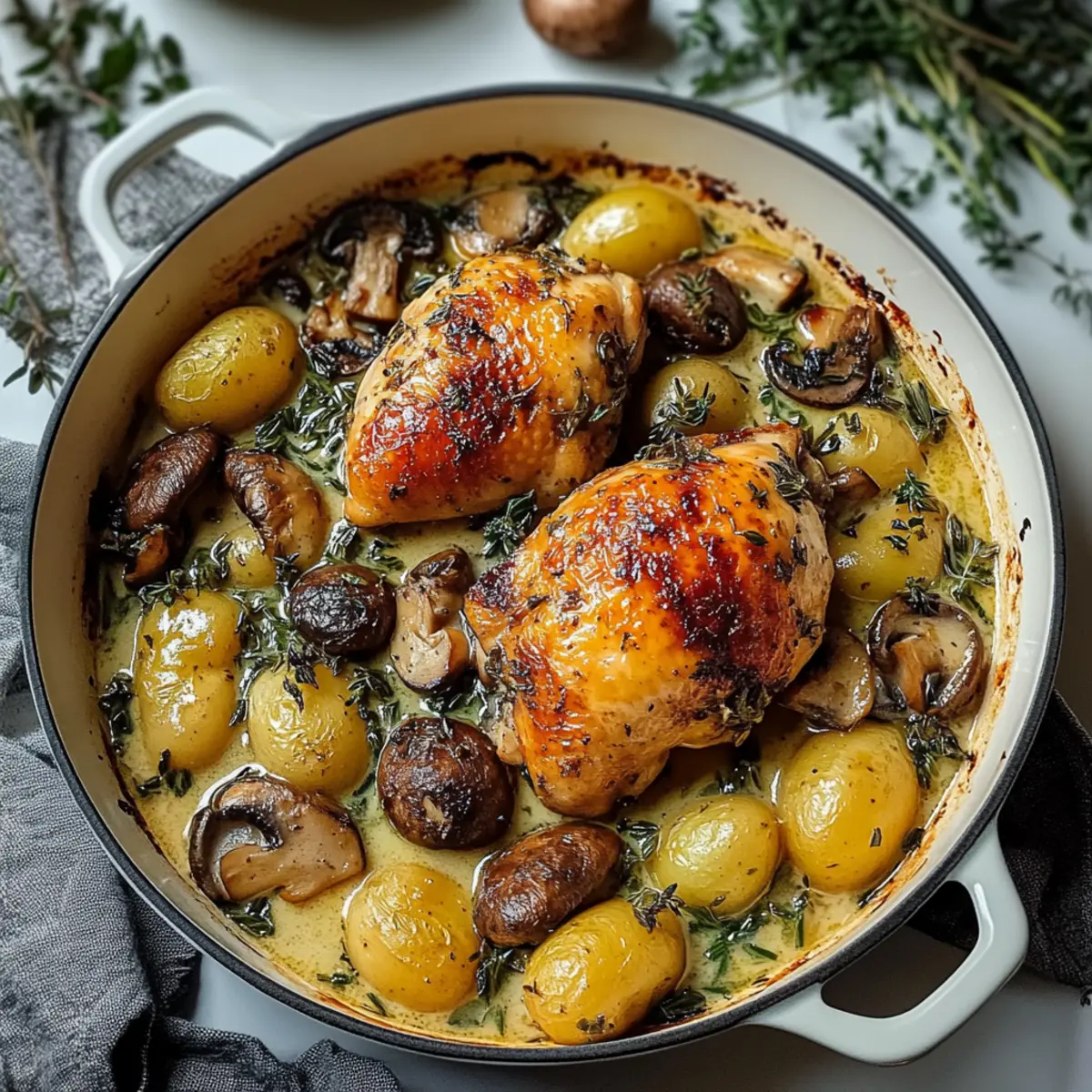 - Combine Chicken and Potatoes: Return chicken to the pot with halved potatoes, cover, and roast in the oven for 40-45 minutes.