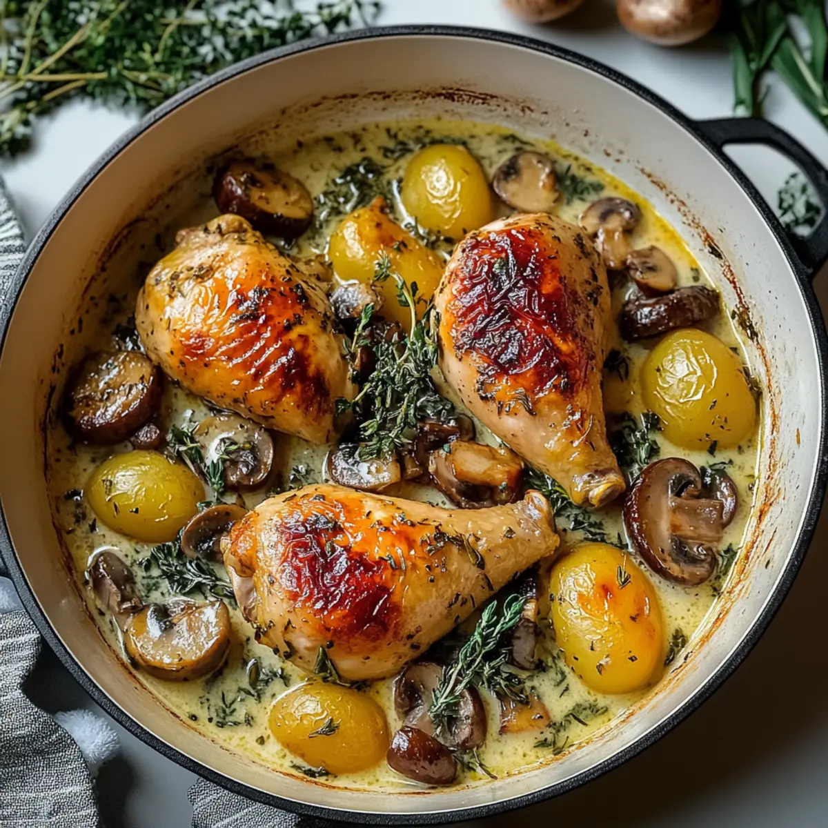 Return the browned chicken to the pot, nestling the pieces into the fragrant sauce. Add 1 pound of halved baby potatoes around the chicken. Cover the Dutch oven with a lid and transfer it to the preheated oven. Roast for 40–45 minutes, or until the chicken reaches an internal temperature of 165°F (75°C) and the potatoes are tender. The aroma will be enticing as your Herb Roasted Chicken cooks!