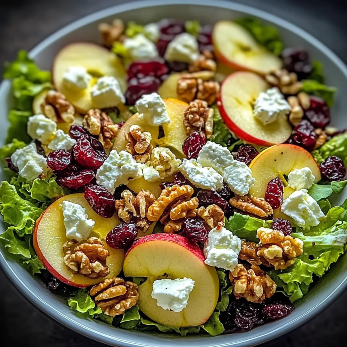 Sprinkle 1 cup of crumbled feta cheese evenly over the salad, allowing the creamy texture to intermingle with the crisp apple slices. Next, add ½ cup of chopped walnuts, distributing them throughout the salad for that satisfying crunch. Follow this with ½ cup of dried cranberries, creating small bursts of sweetness to complement the other flavors perfectly.