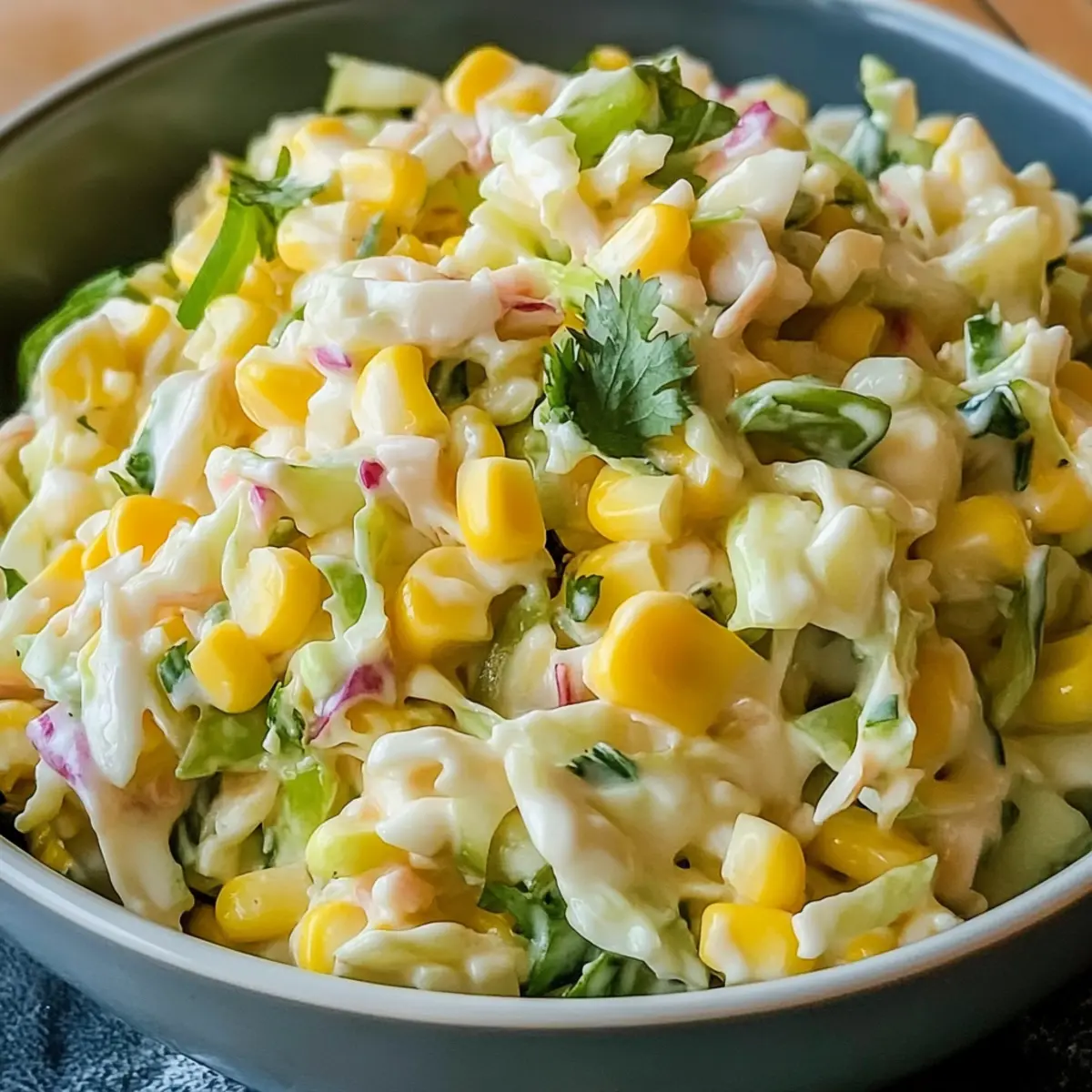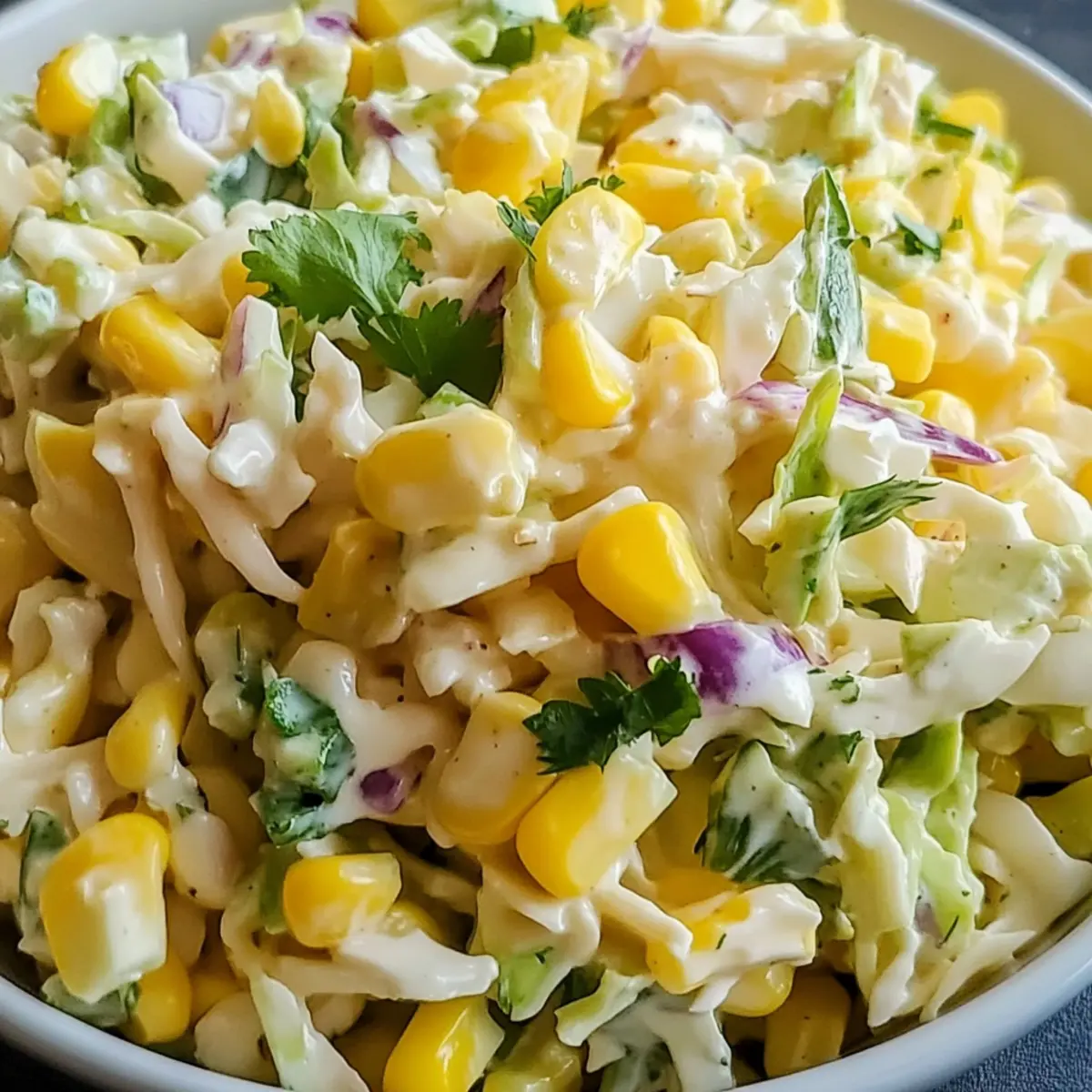 - In a large mixing bowl, combine the coleslaw mix and sweet corn.