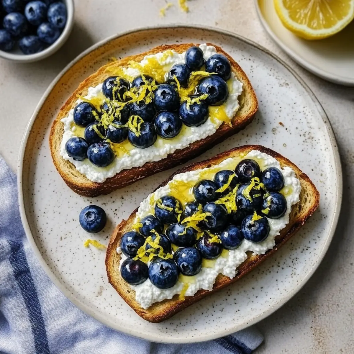 Adjust Toppings: Don’t hesitate to adjust the amount of ricotta or blueberries based on the size of your bread slices; personal preference makes each Lemon Blueberry Ricotta Toast unique.