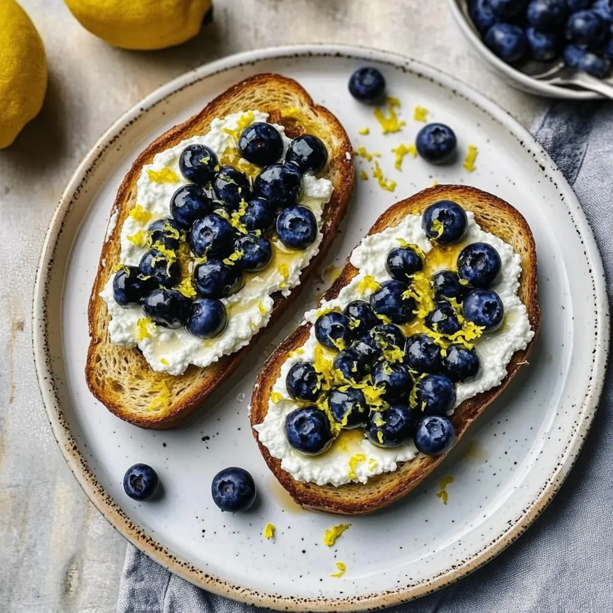 Once assembled, it’s essential to serve your Lemon Blueberry Ricotta Toast immediately for the best texture and flavor. The contrast between the creamy ricotta, juicy blueberries, and crispy bread makes every bite a joy. Enjoy this scrumptious toast as a quick breakfast or a charming snack anytime!