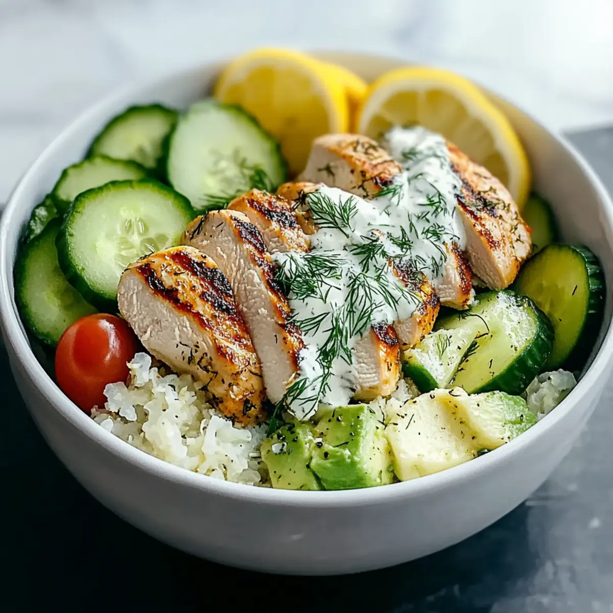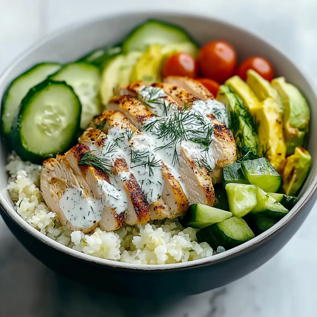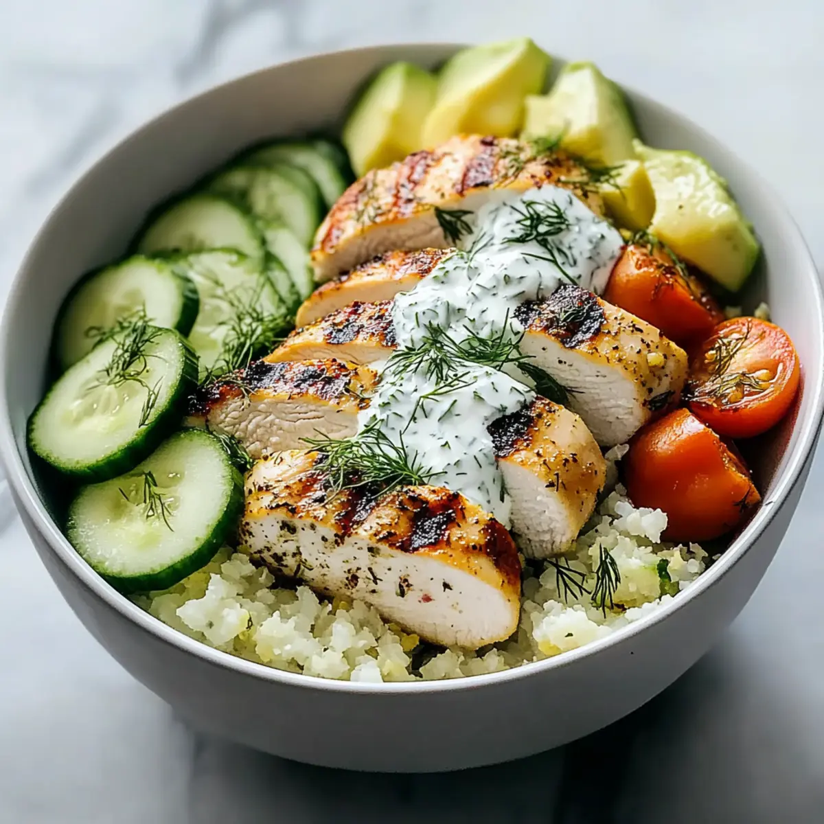 - Assemble the bowls with cauliflower rice, sliced chicken, cucumbers, avocado, and cherry tomatoes topped with dill yogurt sauce.