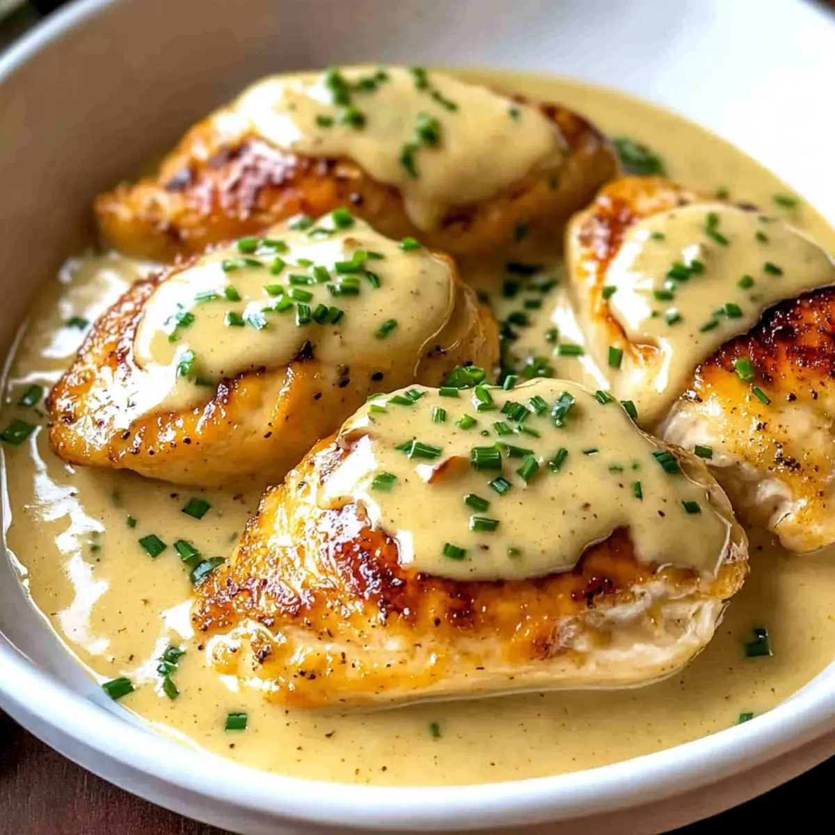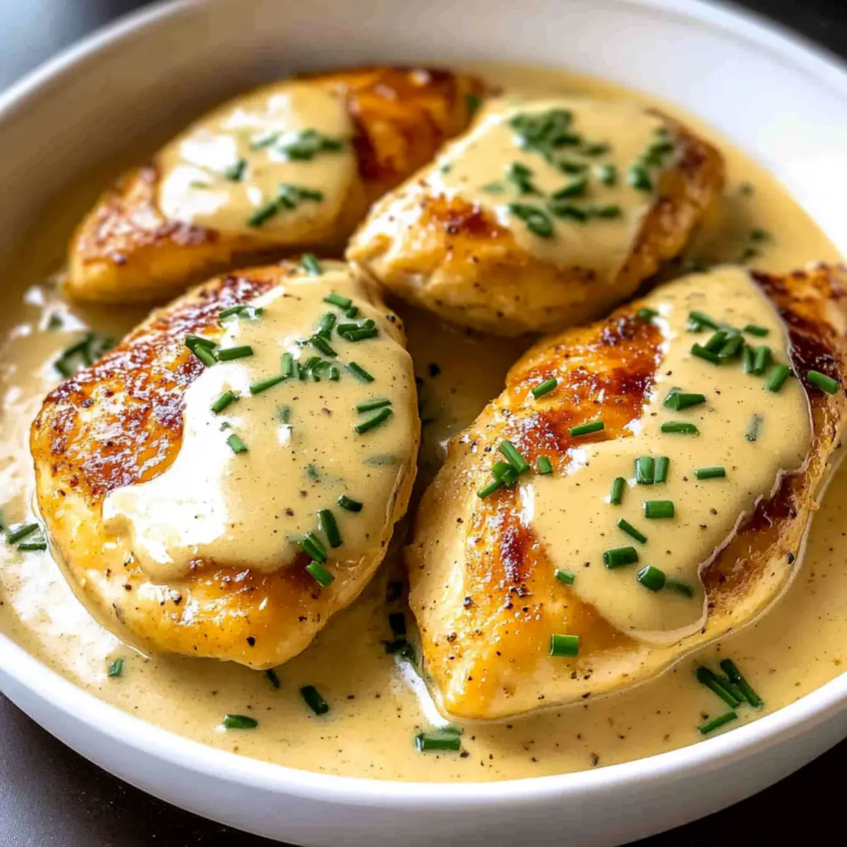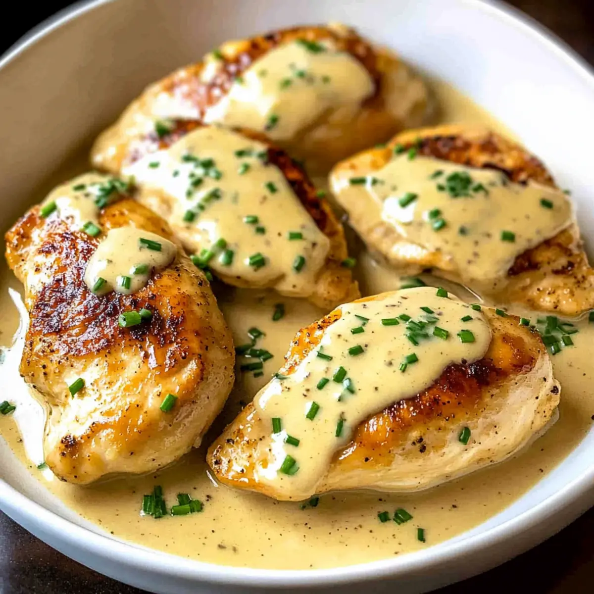 - Serve the chicken with creamy sauce spooned over each piece, garnished with chopped chives.