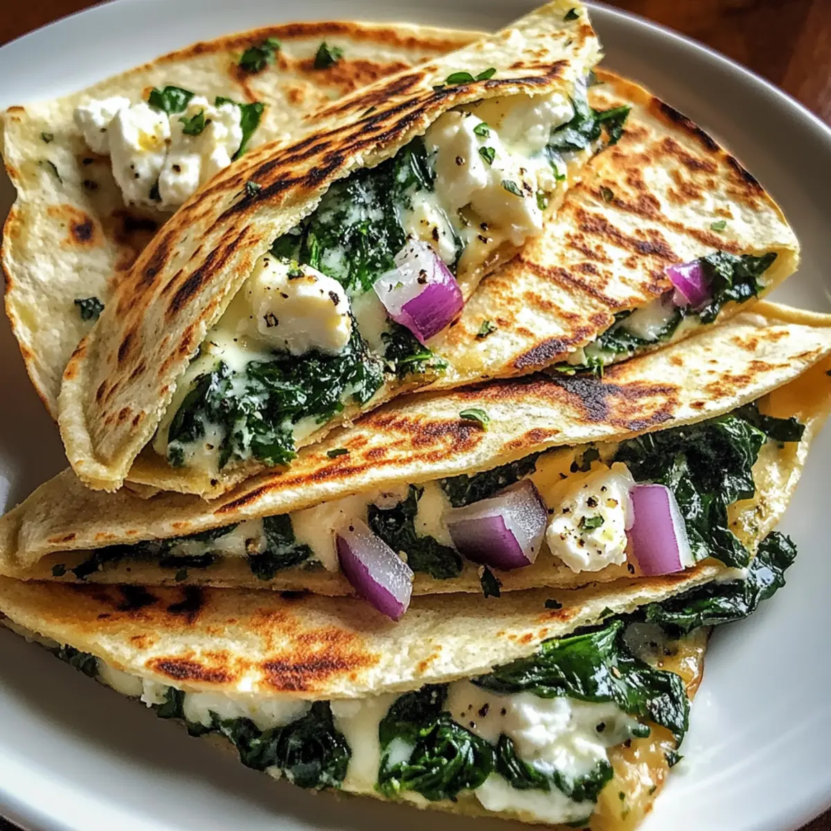 Choose Fresh Ingredients: Opt for fresh spinach and quality cheeses to heighten the flavors of your Mediterranean quesadillas with spinach, feta, mozzarella, and red onion.