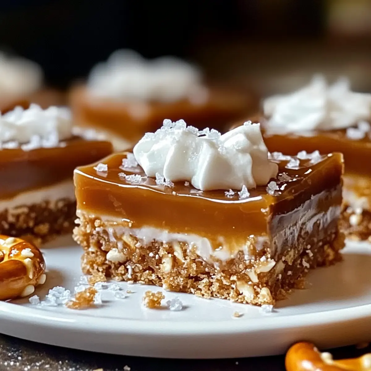 As I stood by the kitchen counter, the scent of sweet caramel wafting through the air, I couldn’t help but smile. Today, I’m sharing my Quick No-Bake Salted Caramel Pretzel Bars—a delightful dessert that offers both the crunch of pretzels and the luxurious richness of caramel. What makes these bars truly special is their ease of preparation; no baking is required, making them a go-to for busy weeknights or last-minute gatherings. Plus, they’re infinitely customizable—whether you want to swap in graham crackers for the crust or add a fruit layer underneath the creamy topping, the options are endless! With a blend of textures and flavors that will wow your friends and family, these bars are sure to become a cherished favorite. Curious about how to whip these up in no time? Let’s dive into the recipe!
