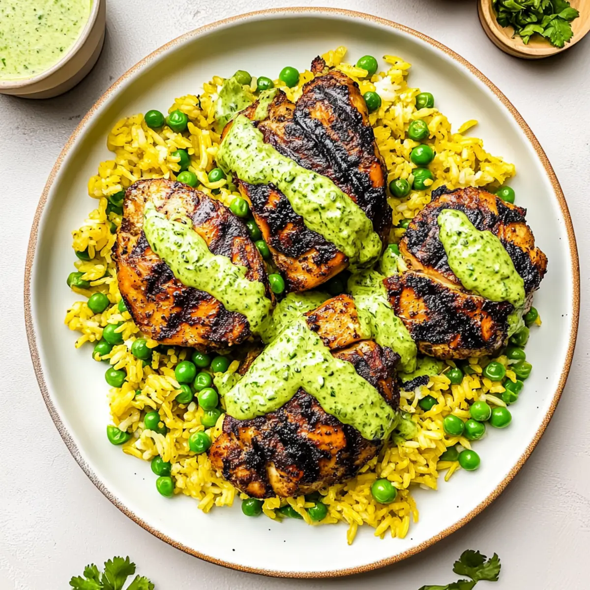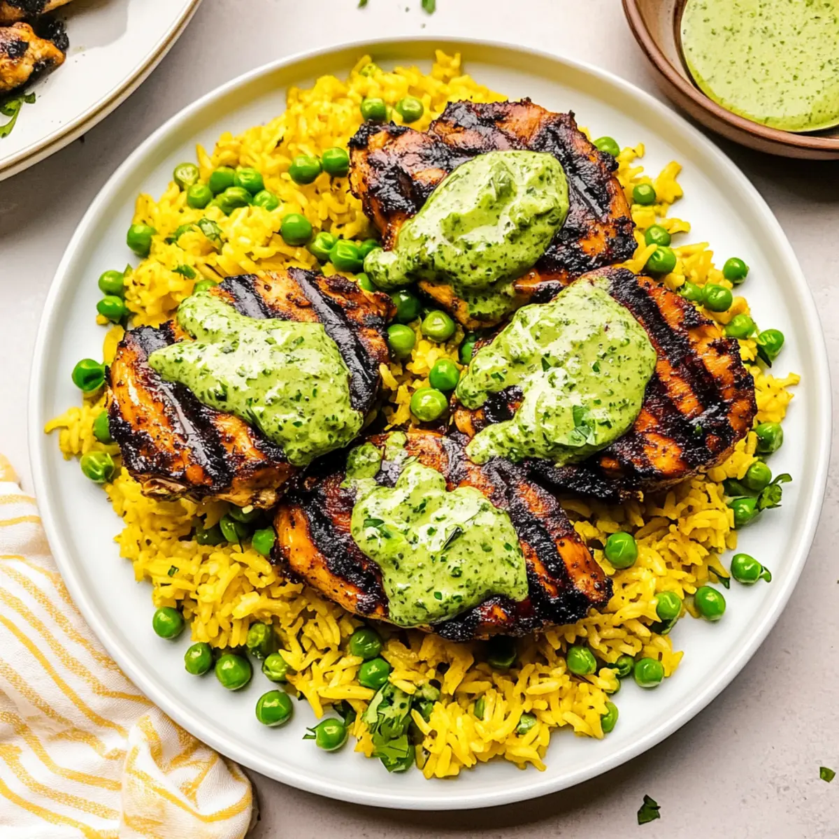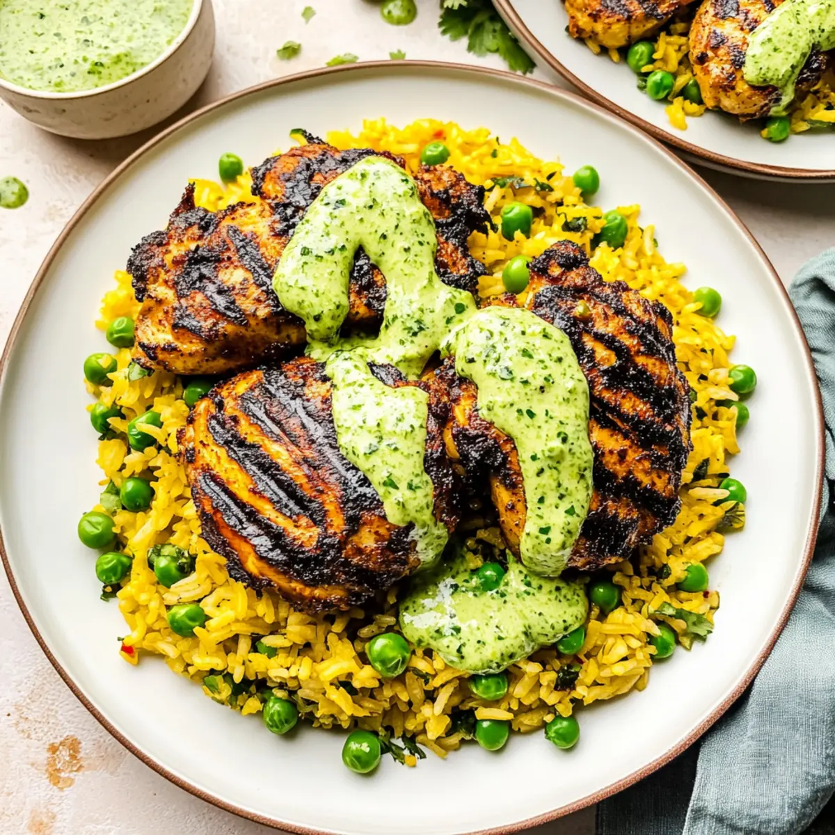 - To plate, scoop a generous portion of the fluffy yellow rice on each dish, then top it with the grilled chicken pieces. Drizzle the creamy green sauce over the chicken.