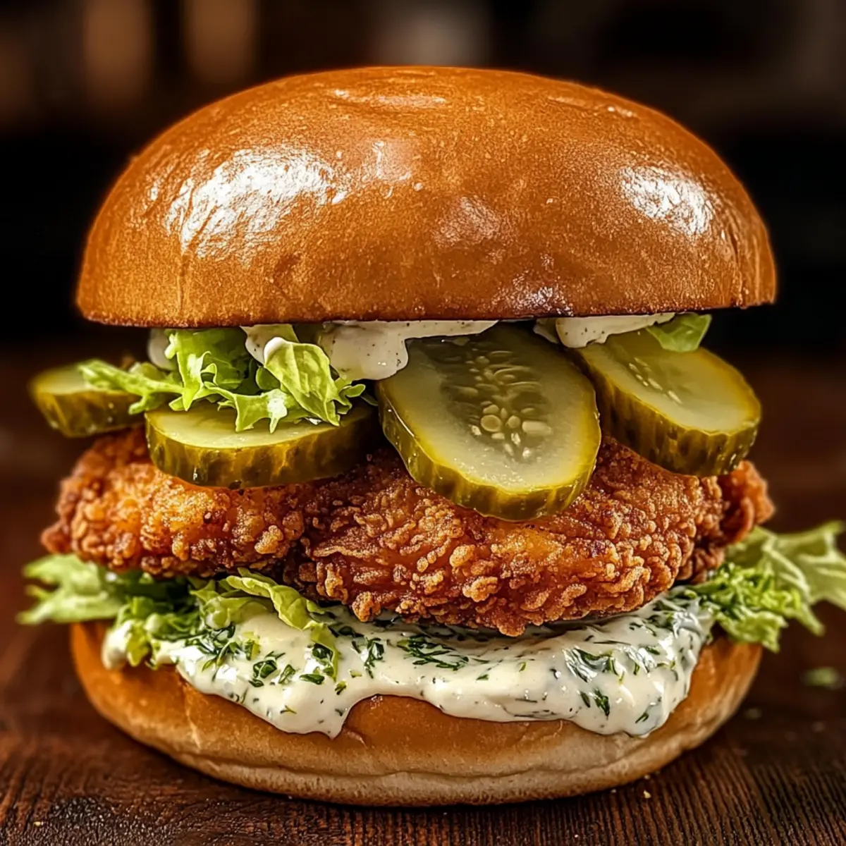 - Assemble the sandwich with toasted buns, creamy sauce, lettuce, fried chicken, and sliced pickles.