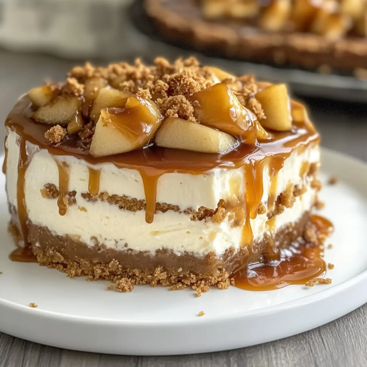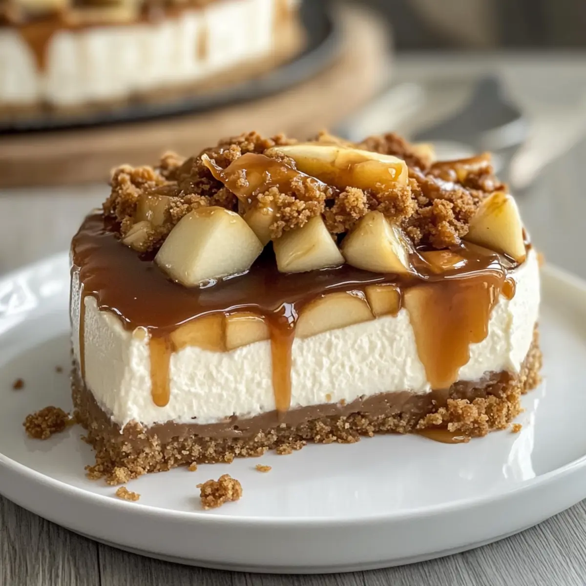 Fruit Swap: Substitute pears or peaches for the apple topping, enhancing its flavor profile and giving a fresh twist. The sweet and juicy fruits provide a perfect contrast to the creamy cheesecake.