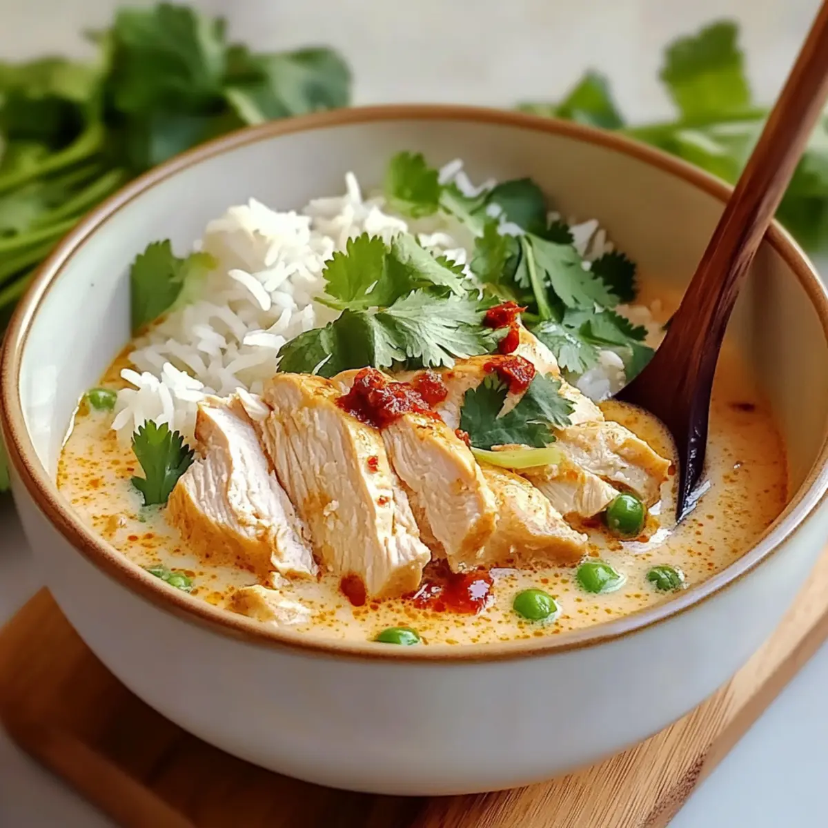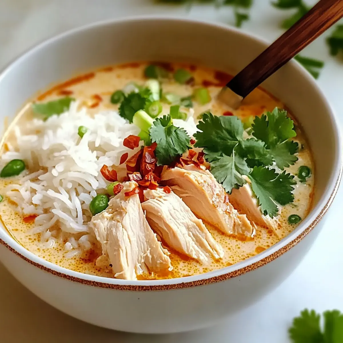 To serve, spoon cooked jasmine rice into individual bowls, then ladle the luscious broth over the top. Add the sliced chicken on each bowl, ensuring a balance of rice and broth. This final touch creates a beautiful presentation, highlighting the heartwarming flavors of your Savory Coconut Chicken Brothy Rice.