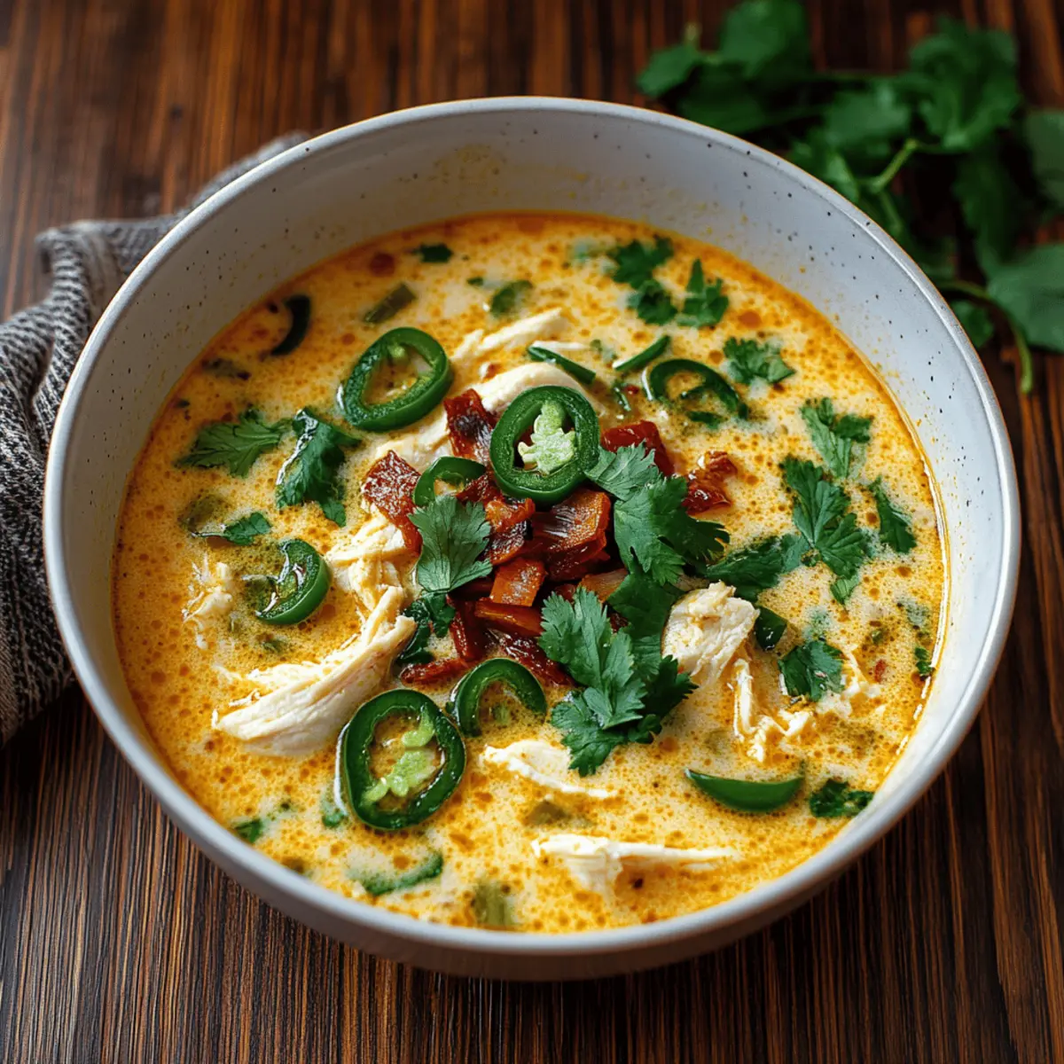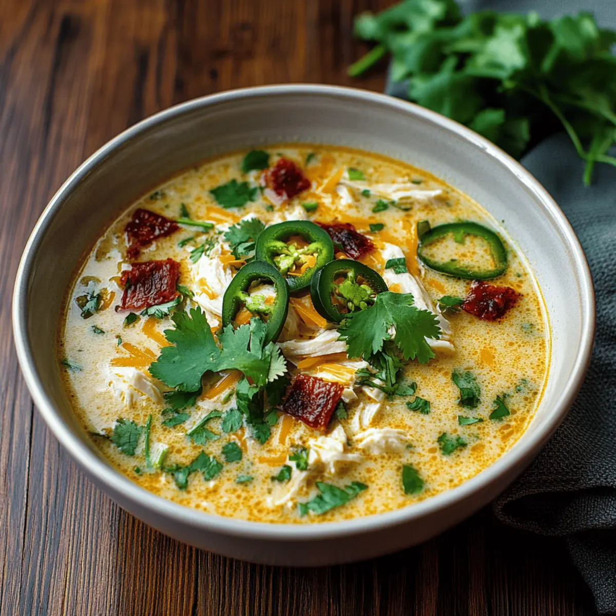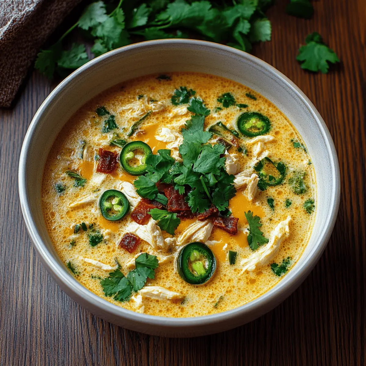 Finally, serve the soup hot in warm bowls, garnished with fresh cilantro to brighten the dish. Enjoy every spoonful of your Spicy Jalapeño Popper Chicken Soup alongside your favorite crusty bread or tortilla chips for a comforting meal perfect for any occasion.