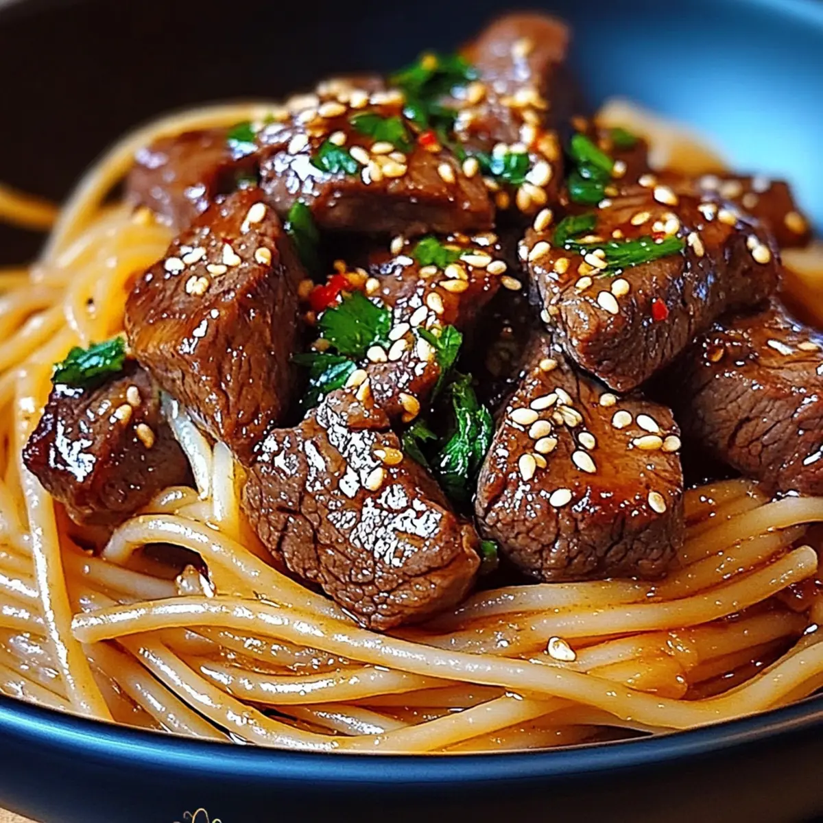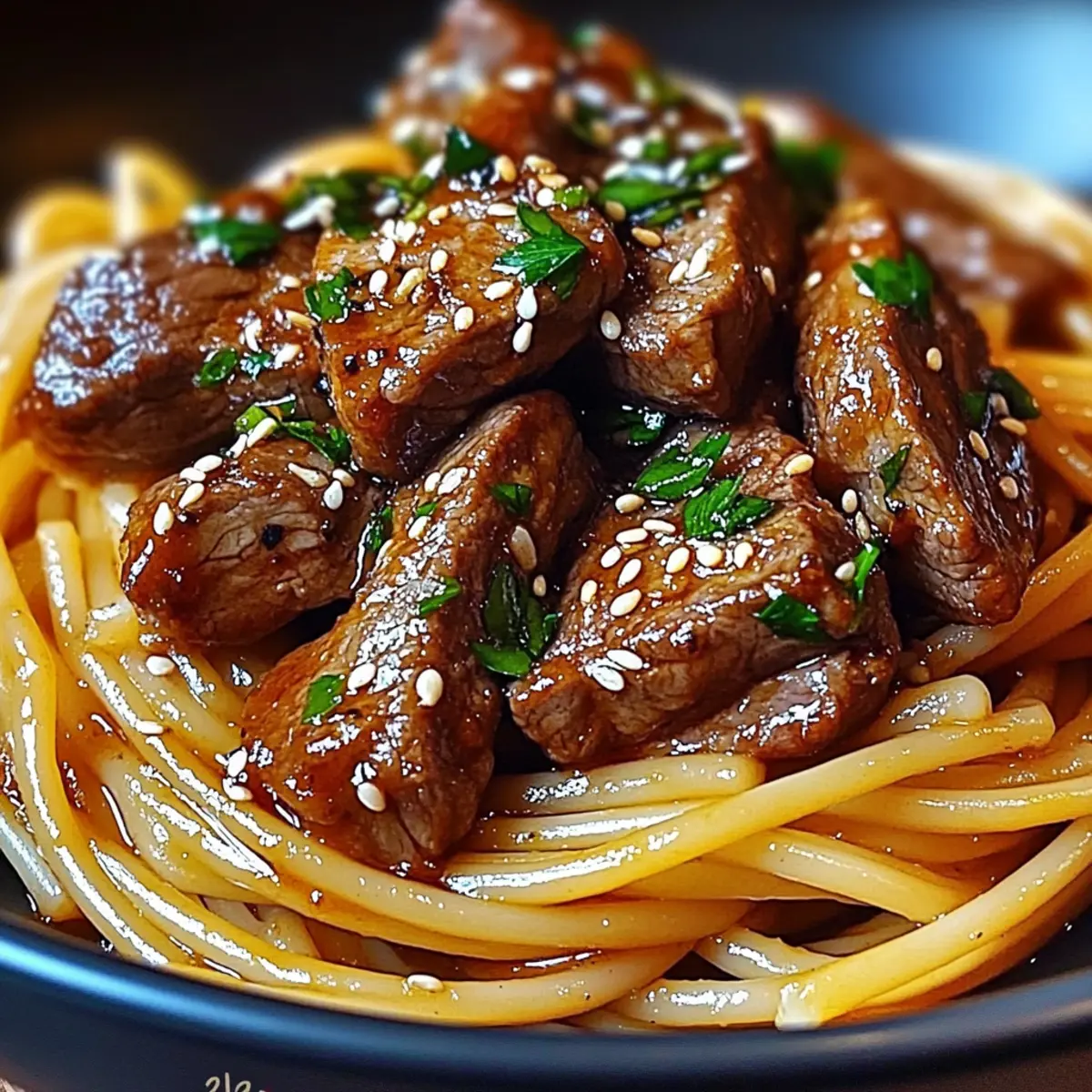 Tantalizing Textures: Enjoy the juicy steak paired with tender, al dente pasta, complemented by a sprinkle of crunchy sesame seeds for the perfect finish.