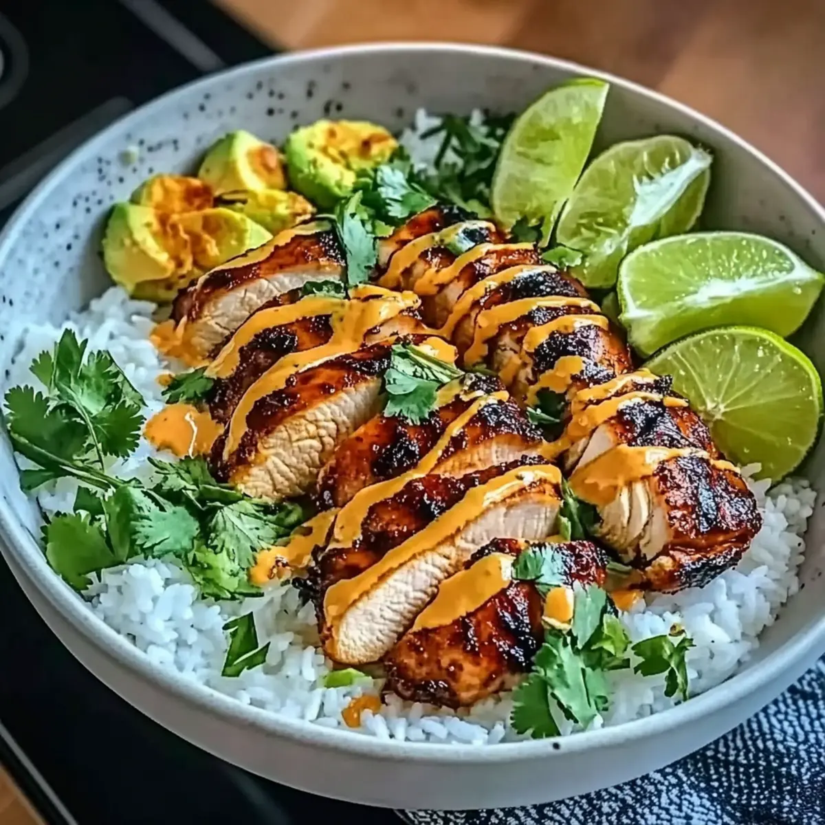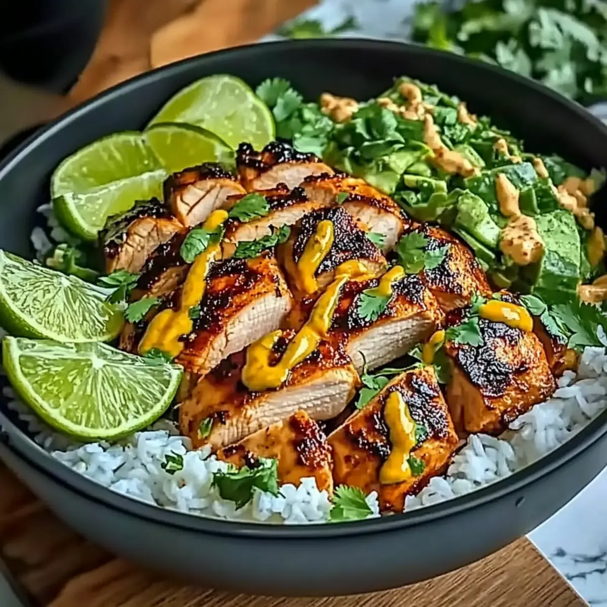 - Assemble the bowl by scooping fluffy jasmine rice, adding sliced chicken, and drizzling with coconut lime sauce. Garnish with cilantro, lime wedges, and chili flakes if desired.