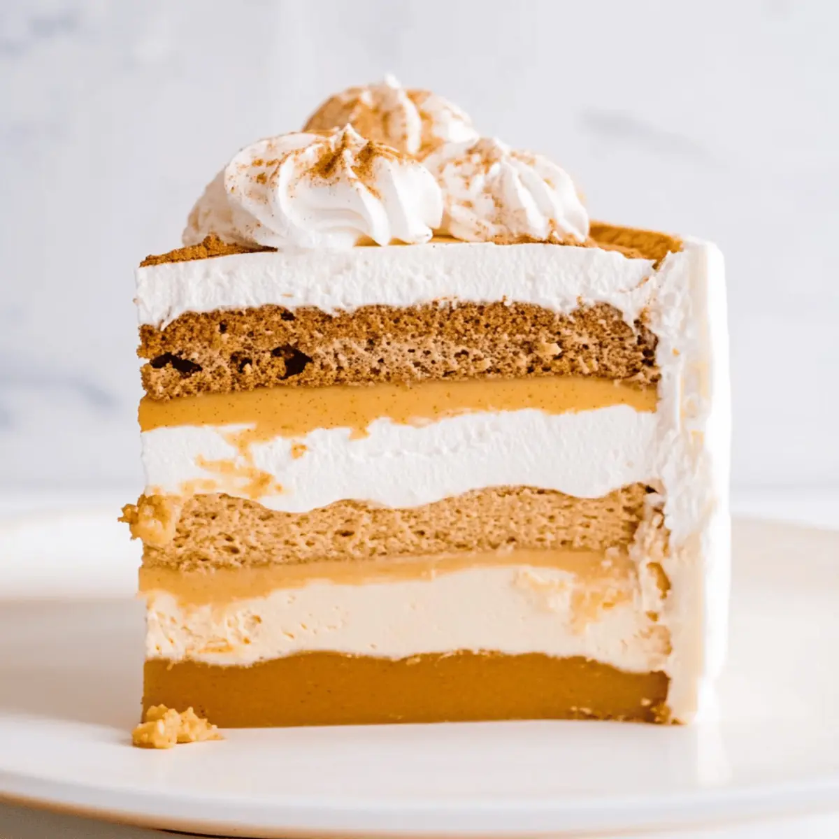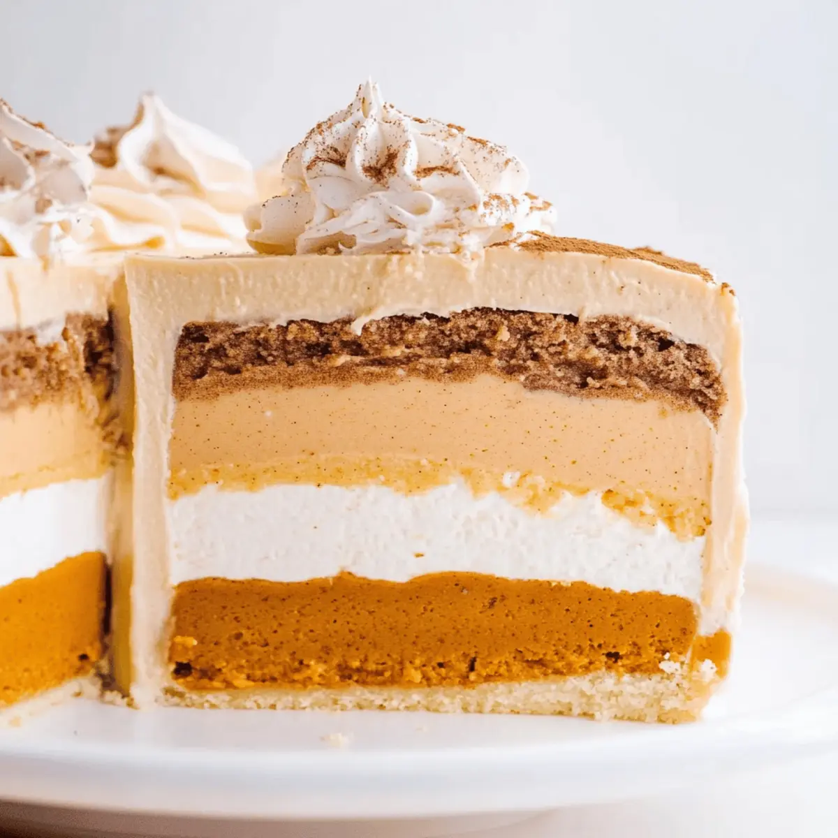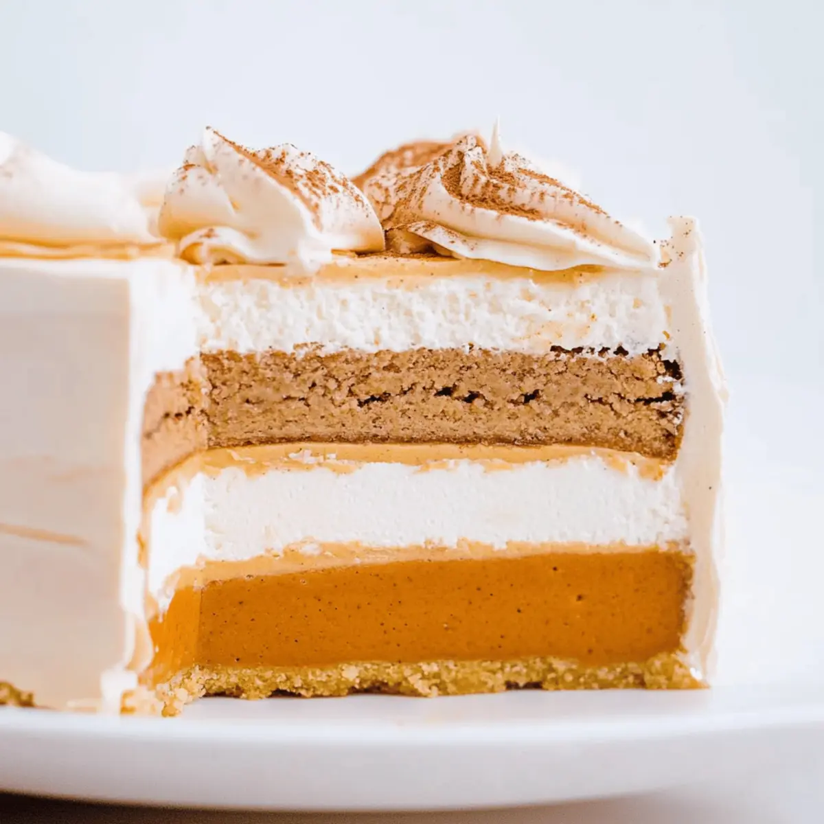 - Trim the cheesecake and spice cake layers for uniformity. Place the cheesecake upside down on a serving plate, frost with buttercream, then layer the spice cake on top and frost again. Finally, layer with the pumpkin pie and cover with remaining buttercream. Chill to set, then decorate as desired.
