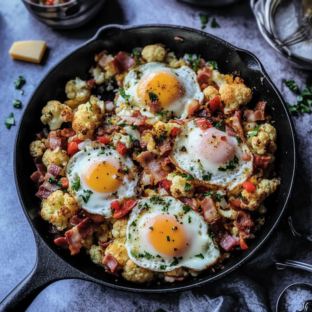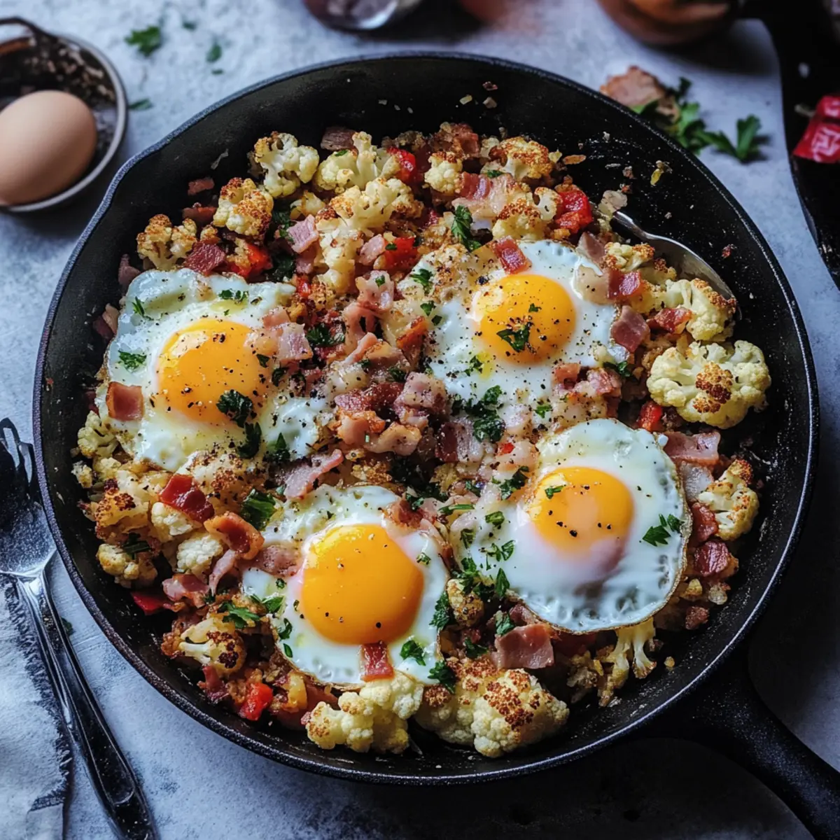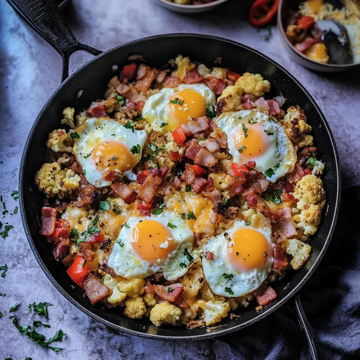 Remove the skillet from heat and sprinkle with freshly chopped parsley for a pop of color and freshness. Serve your Turkish Cauliflower Breakfast Hash warm, and feel free to crumble the crispy bacon on top for added texture. Enjoy this hearty, vibrant dish as a perfect start to your day!