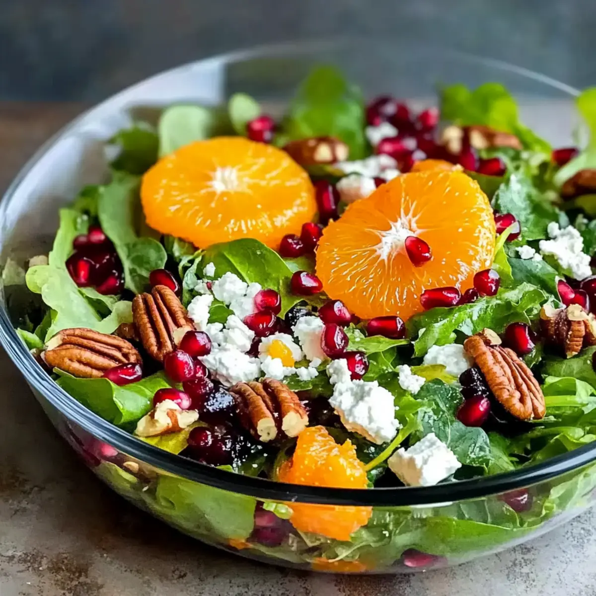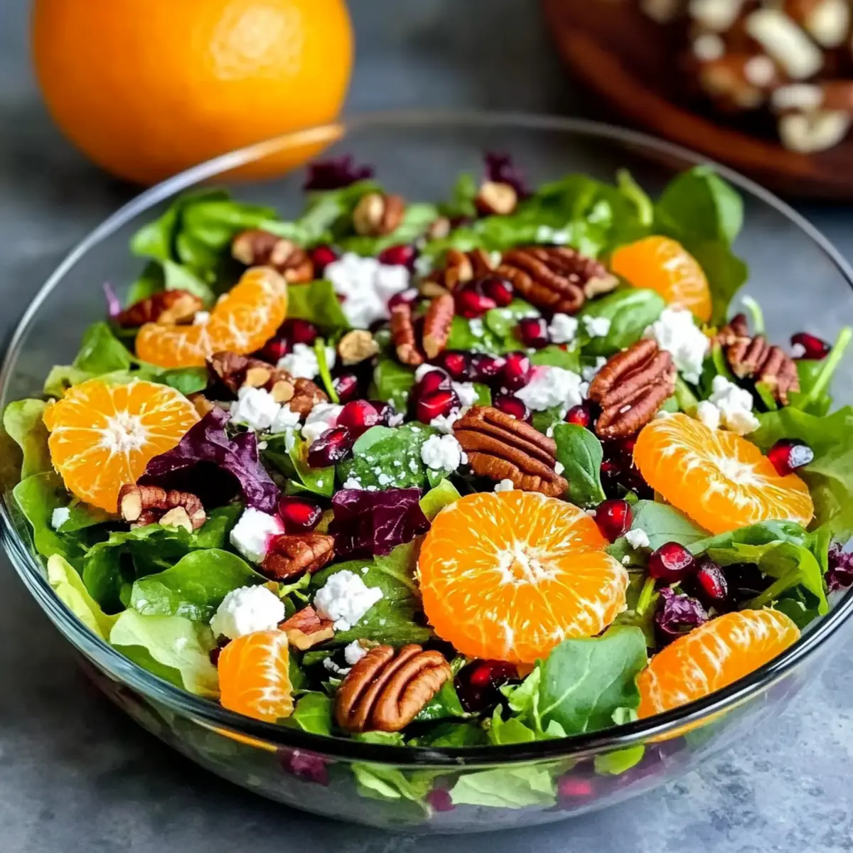 - In a large mixing bowl, combine mixed greens, oranges, pomegranate seeds, and crumbled feta. Fold in candied pecans and toss gently.